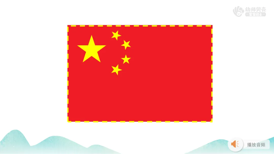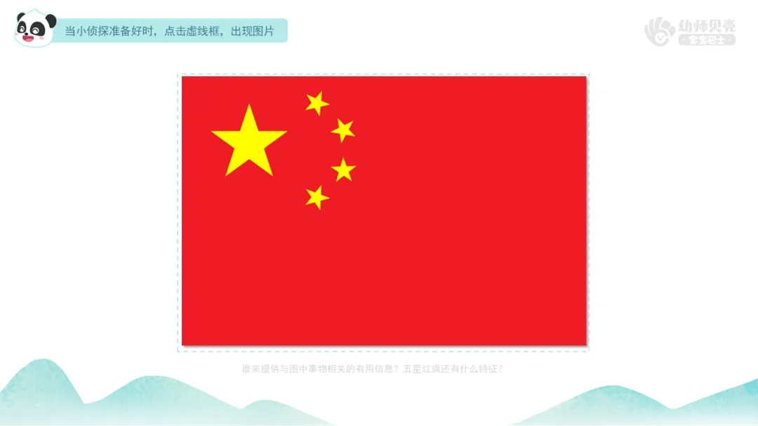 3)出示组图“祖国知名事物-五星红旗”,鼓励幼儿在游戏中大胆描述关于五星红旗的信息。
