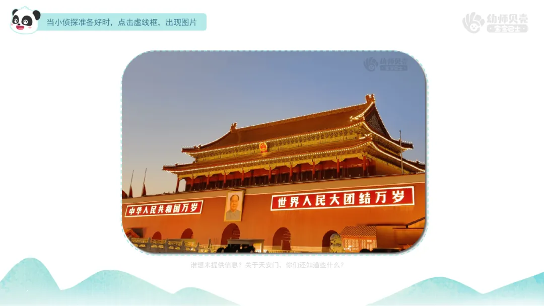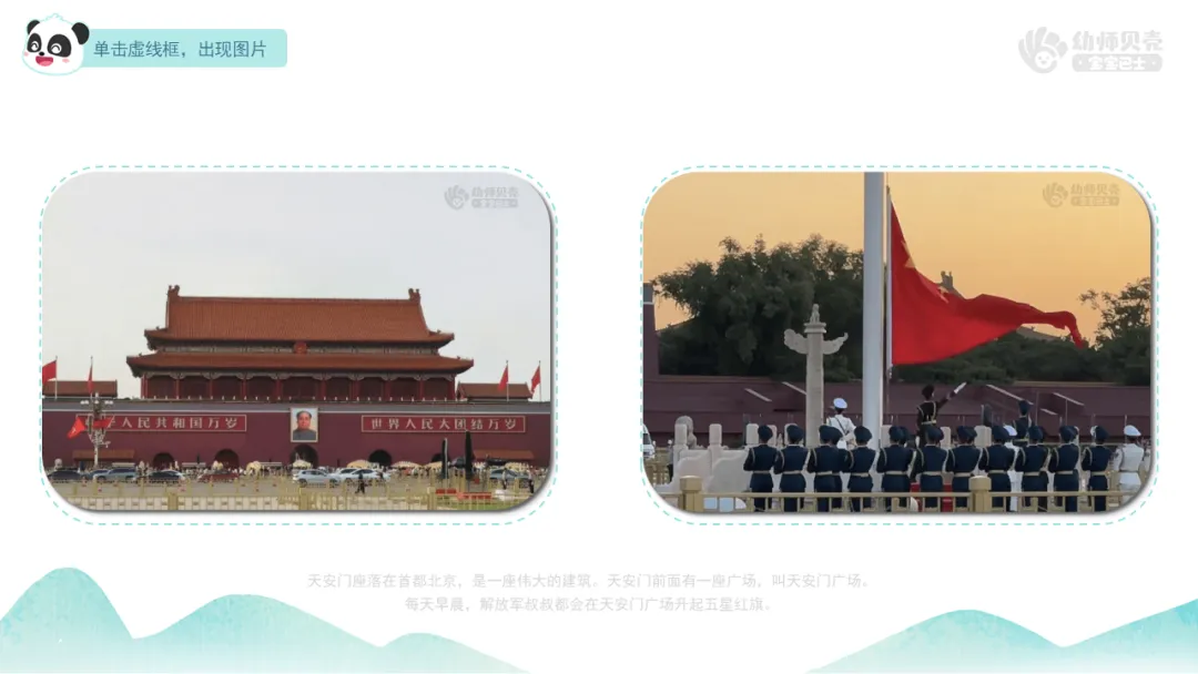 4)出示组图“祖国知名事物-天安门”,鼓励幼儿在游戏中描述关于天安门的信息,加深对天安门的认识。