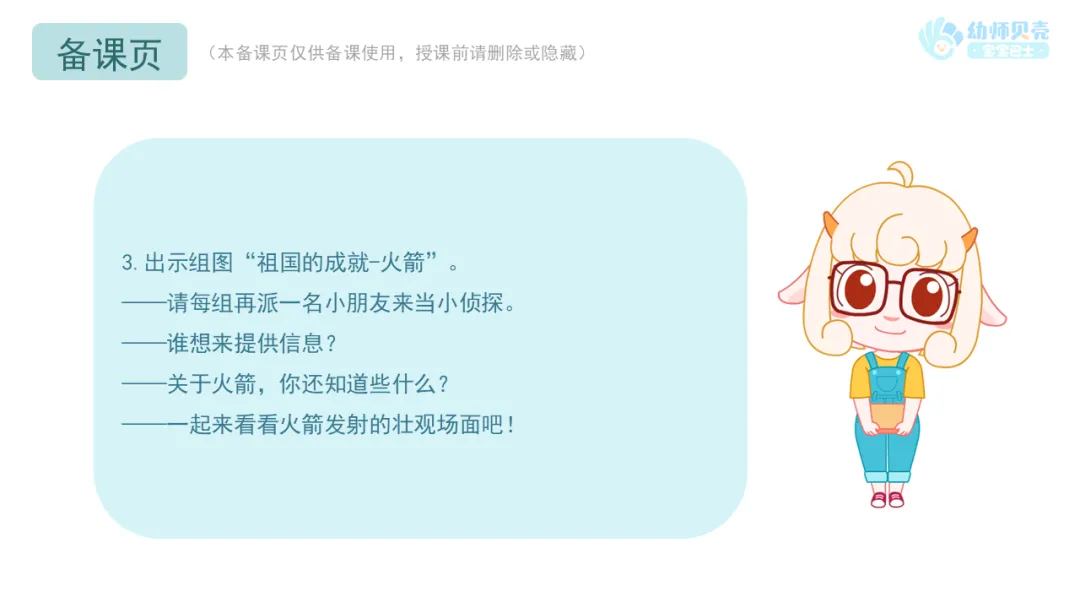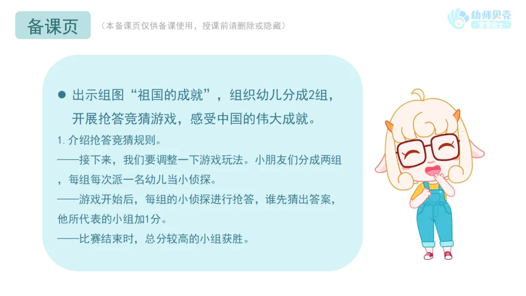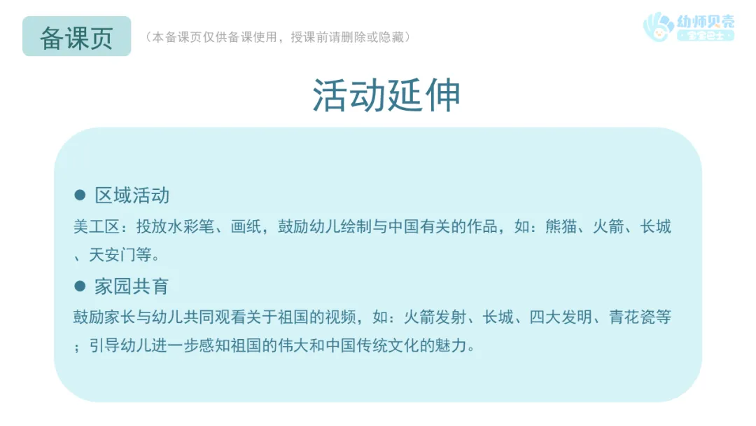 通过准备以上课件和经验准备,可以提供丰富的视觉辅助材料,帮助幼儿直观地理解活动内容。首先,经验准备中的“你来比划我来猜”游戏经历,有助于教师更好地理解幼儿的认知特点和游戏喜好,从而更有针对性地引导幼儿参与本次活动。其次,准备了中国文化和重要成就相关的图片,能够提供视觉材料,激发幼儿的兴趣,帮助他们更直观地理解和认识祖国的文化和成就。这样的课件准备有助于将抽象的概念具象化,让幼儿更容易理解和记忆。此外,准备充分的课件还为教师示范提供了有力工具,能够在引导幼儿活动时更具效果。整体而言,经验准备和课件准备的有机结合,能够提升教学效果,使幼儿更积极参与活动,更深刻地理解和体验祖国的文化和成就。