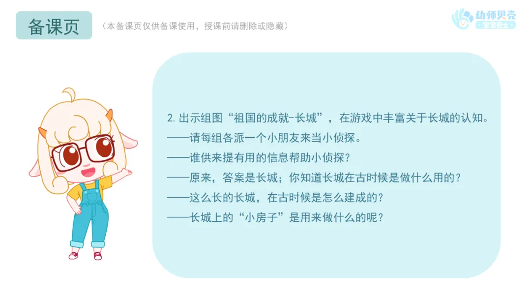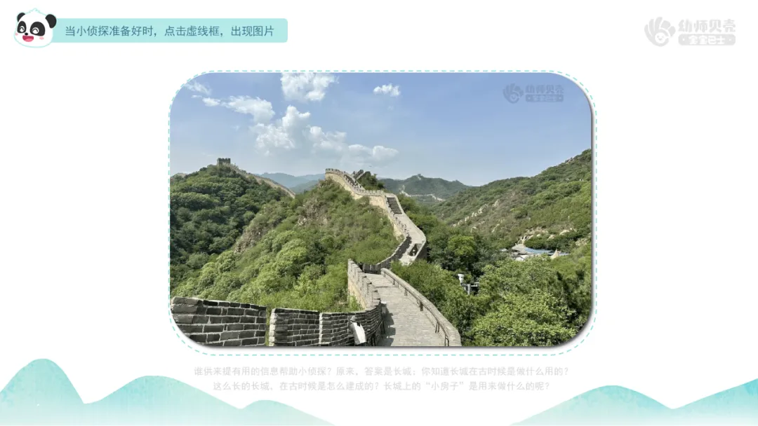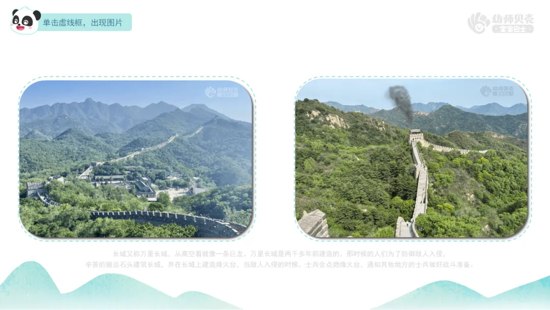 2)出示组图“祖国的成就-长城”,在游戏中丰富关于长城的认知。