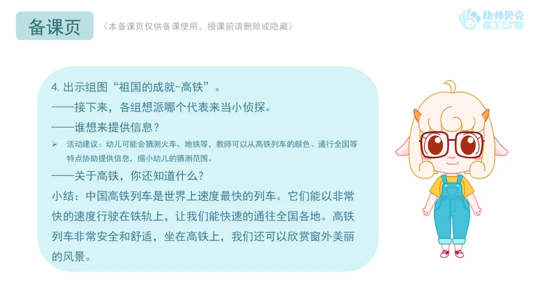 2.通过深入了解国家的知名事物和成就,幼儿能够扩展他们的知识面,拓宽视野。这有助于培养他们的好奇心和求知欲,激发主动学习的动机。加深对中国知名事物及伟大成就的了解,可以帮助幼儿建立正确的历史和文化认知。他们将更好地理解国家的发展历程和文化传承,培养出尊重传统、珍惜文化遗产的价值观。同时,这个目标还有助于培养幼儿的观察力、分析能力和表达能力。通过描述和讨论知名事物的特点和成就,幼儿能够锻炼语言表达和逻辑思维能力,从而提升综合素养。因此本次活动的认知目标是:加深对中国知名事物及伟大成就了解。