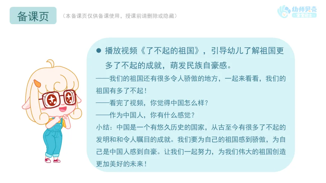 1.通过教学活动,让幼儿深切感受祖国的强大,培养他们内心的民族自豪感。通过了解祖国的伟大成就和知名事物,幼儿可以增强对祖国的认同感,从而建立起自己作为中国人的身份认同。培养民族自豪感也有助于增强幼儿的社会责任感和公民意识。当幼儿深切感受到祖国的辉煌历史和伟大成就时,他们会更加关心国家的发展,愿意为国家的繁荣与进步贡献一份力量。他们将更加珍惜祖国的文化遗产,积极参与社会公益活动,从而培养出积极向上、有社会责任心的品格。因此本次活动的情感目标是:感受祖国的强大,萌发民族自豪感。