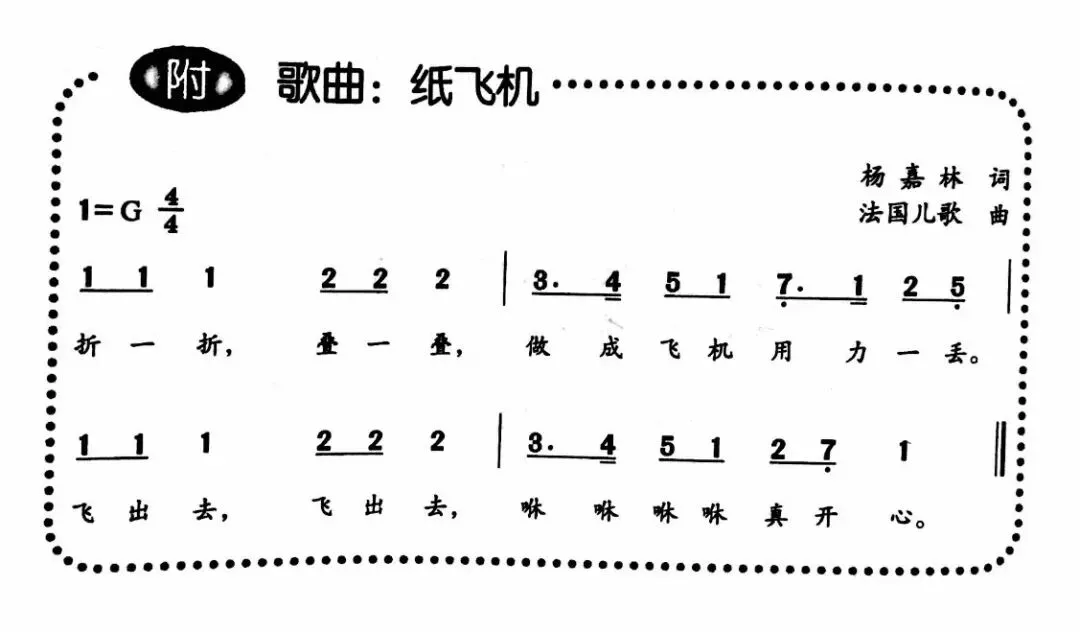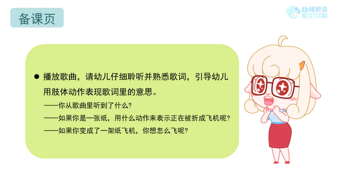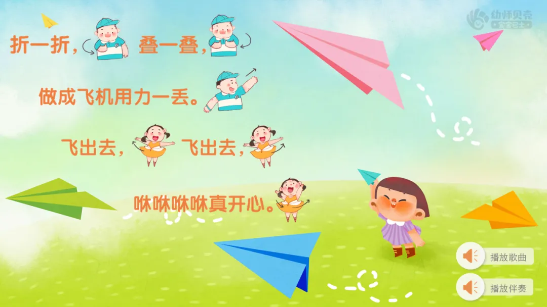 1.课件准备:《纸飞机》歌曲、歌曲伴奏、插图、歌曲动作说明。
