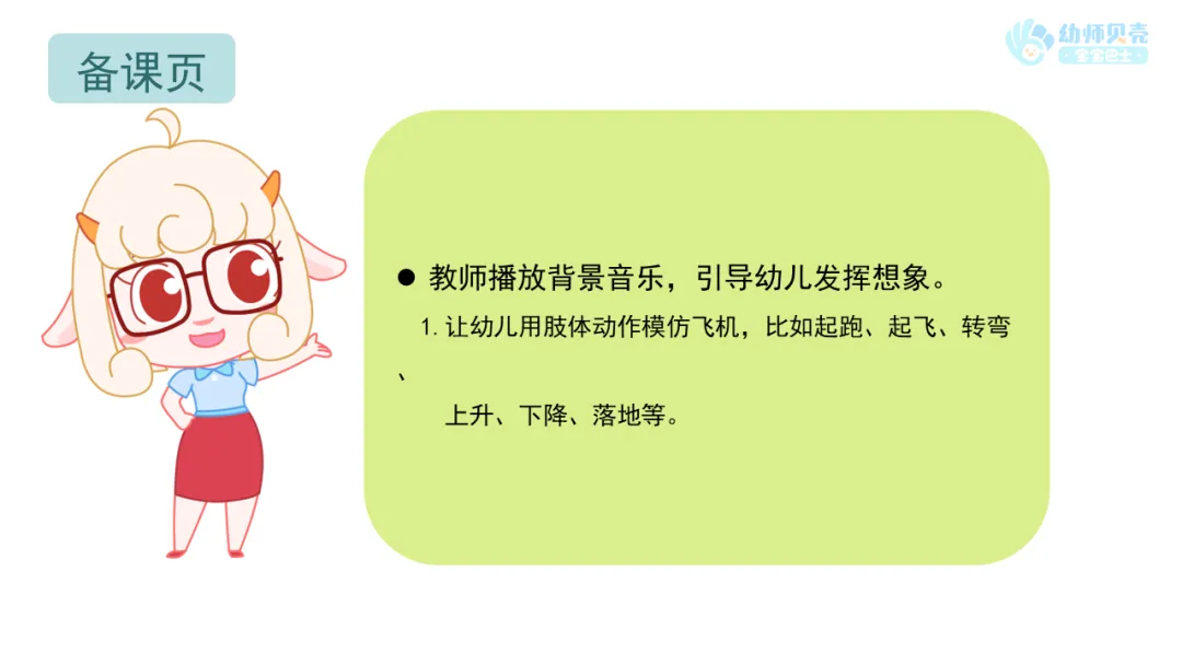 1.让幼儿用肢体动作模仿飞机,比如起跑、起飞、转弯、上升、下降、落地等。