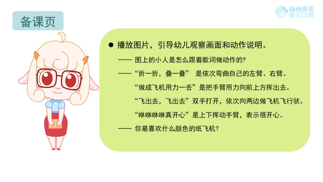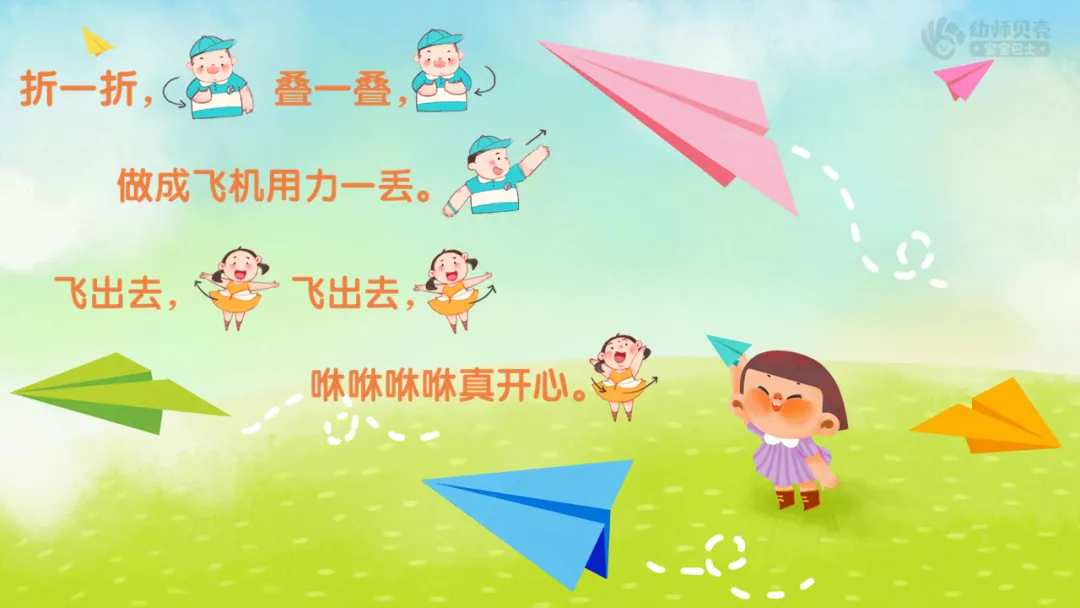──“折一折,叠一叠”是依次弯曲自己的左臂、右臂;“做成飞机用力一丢”是把手臂用力向前上方挥出去;“飞出去,飞出去”双手打开,依次向两边做飞机飞行状;“咻咻咻咻真开心”是上下挥动手臂,表示很开心。