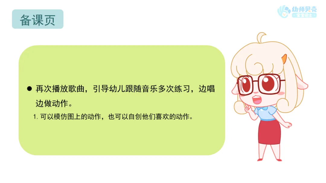l再次播放歌曲,引导幼儿跟随音乐多次练习,边唱边做动作。