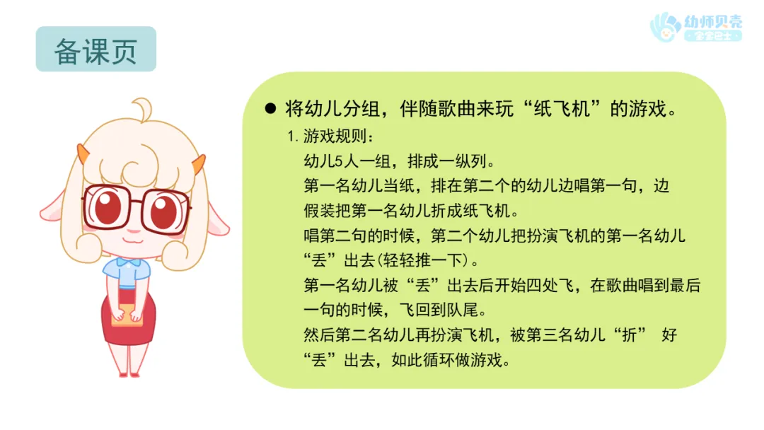 第一名幼儿当纸,排在第二个的幼儿边唱第一句,边假装把第一名幼儿折成纸飞机。