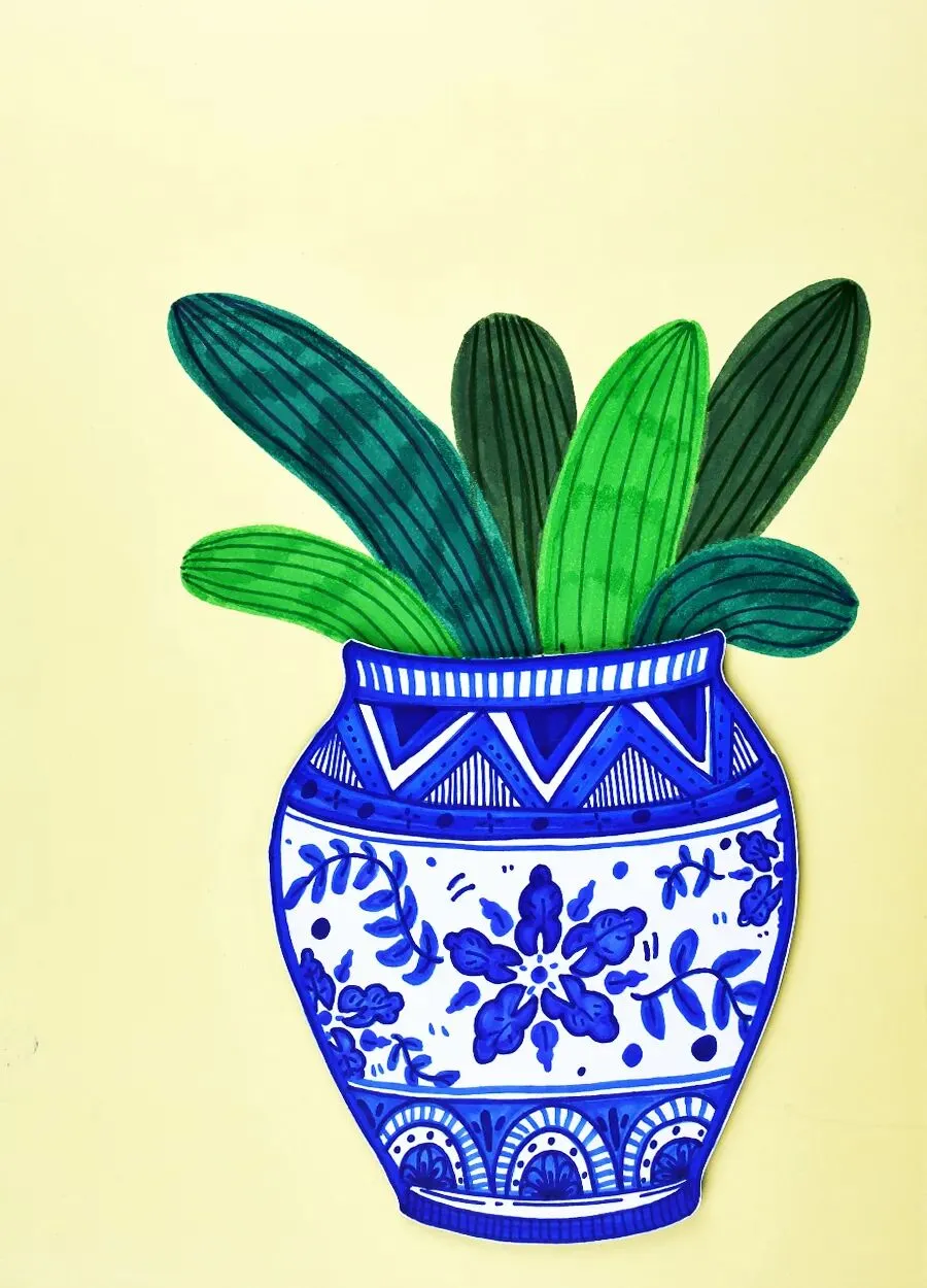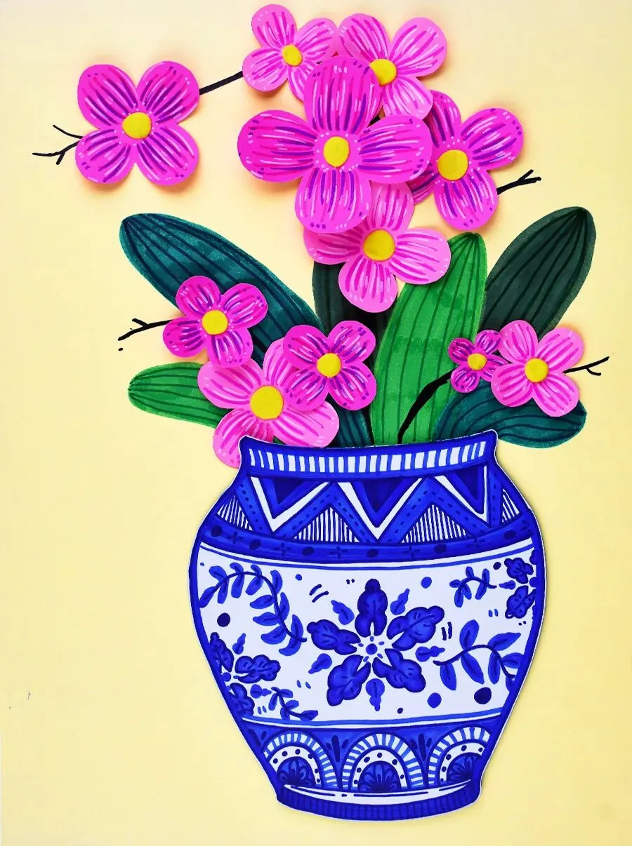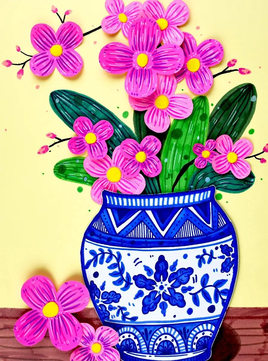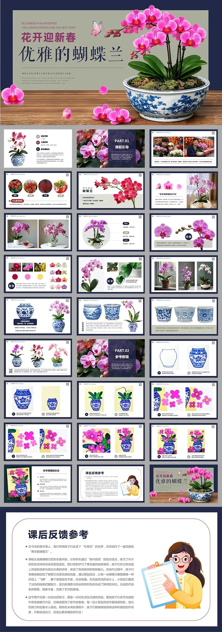 当热烈现代的蝴蝶兰,遇见了拥有千年历史的青花瓷,会碰撞出怎样的火花呢?在今天的美术课程中,让我们拿起画笔,用红与蓝的色彩协奏,画出一盆意境优美、充满东方韵味的年宵花吧!