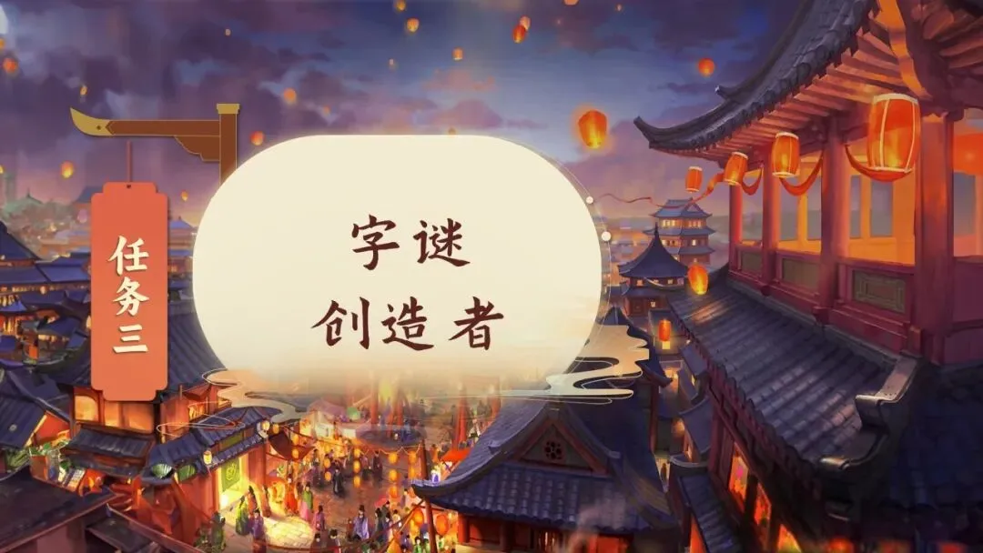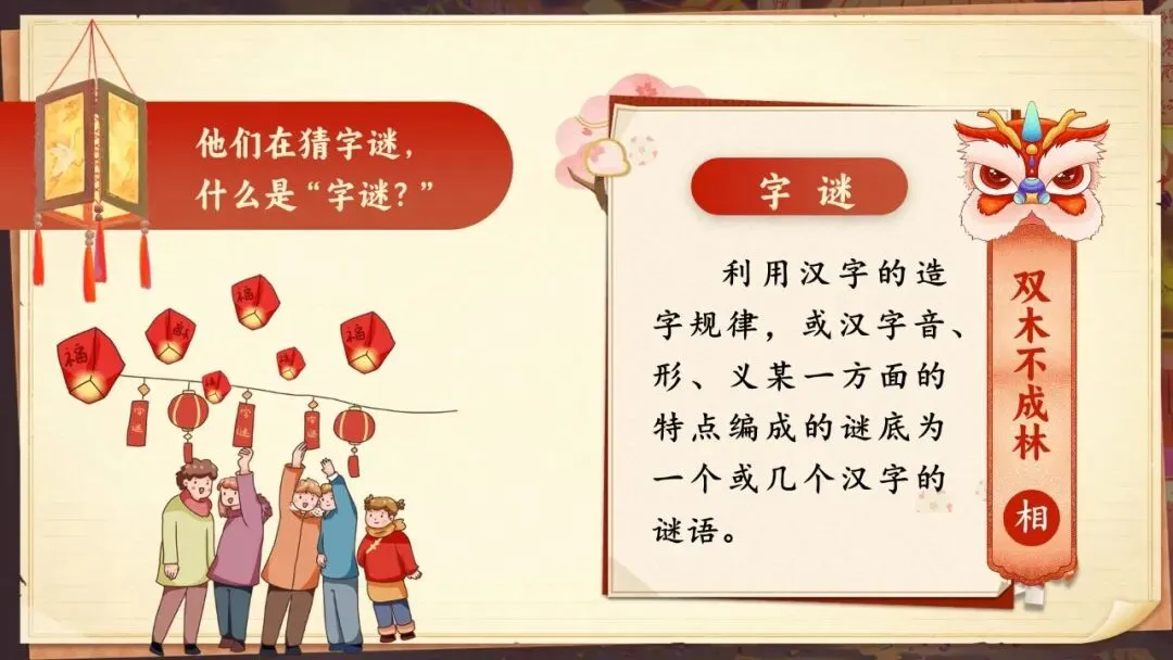 ·场景设置:在字谜小镇的奇妙市场上,市场被装饰得色彩斑斓,每个摊位上都挂着与元宵节相关的字谜。孩子们兴奋地穿梭于摊位之间,寻找并阅读这些谜语。