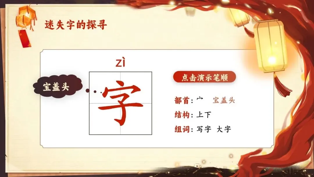 ·活动导入:孩子们在寻找过程中聚集在一处,围绕一个用灯笼装饰的摊位。教师引导学生观察,问:他们在干什么?生答:猜字谜。