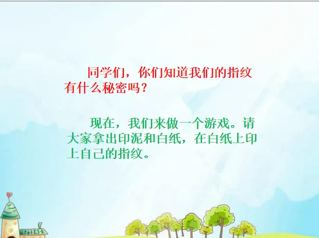 现在,我们一起来做一个小游戏。请大家准备好印泥和白纸,看看我们的指纹藏着什么秘密。
