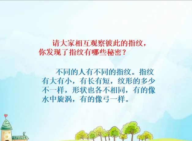 师:现在我们请一些同学来说一说,你发现了指纹有哪些秘密?