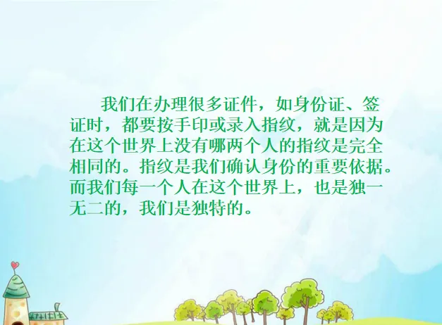 师总结:同学们,你们观察得很仔细。我们在办理很多证件,如身份证、签证时,都要按手印或录入指纹,指纹是我们确认身份的重要依据,就是因为在这个世界上没有哪两个人的指纹是完全相同的。同样,我们每个人在这个世界上也是独特的。