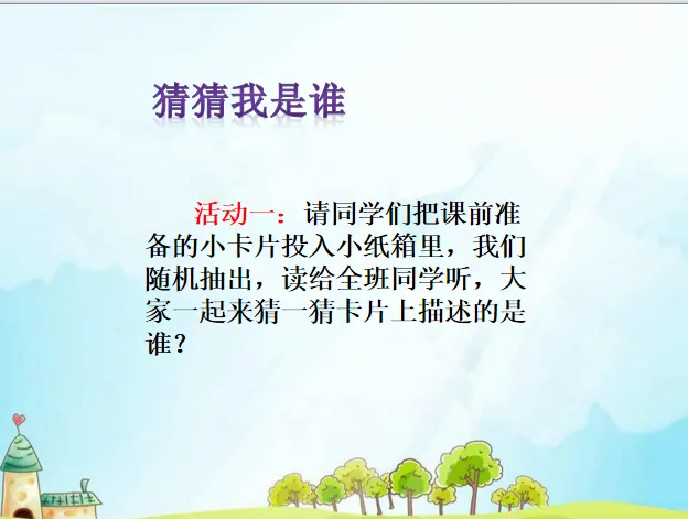 师:现在请同学们把准备好的小卡片投入讲台的小纸箱里面,然后我随机抽取几位同学的小卡片,念给全班同学听,大家一起来猜猜这个小卡片里面描述的主人公是谁。