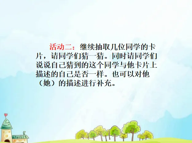 现在我们每个人准备一张小卡片,在卡片上对自己进行描述(可以是性格、爱好、特长等方面的内容),最后署名。