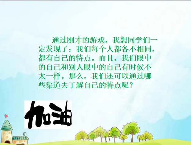 虽然我们每个人都能找到自己的特点,但是刚才的小游戏也说明我们眼中的自己和别人眼中的自己有时候不太一样。我们还可以通过哪些渠道去了解自己的特点呢?
