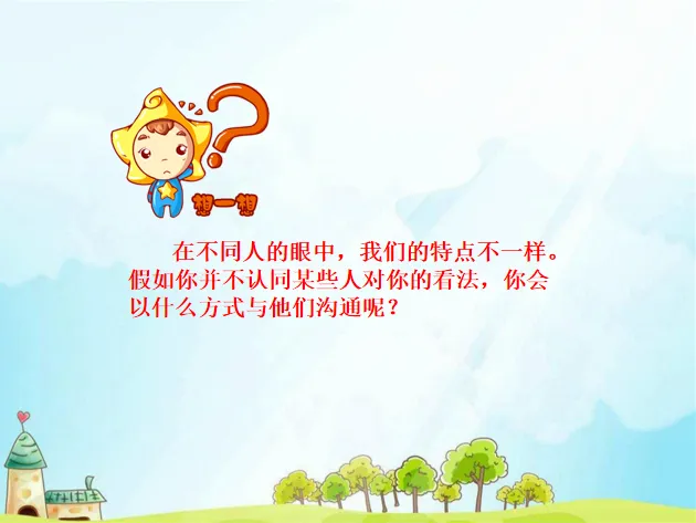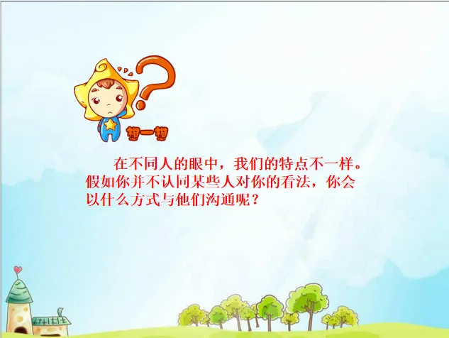 师:在不同人的眼中我们的特点不一样。假如你不认同某些人对你的看法,你会以什么方式与他们沟通呢?