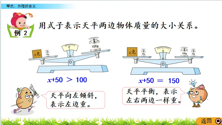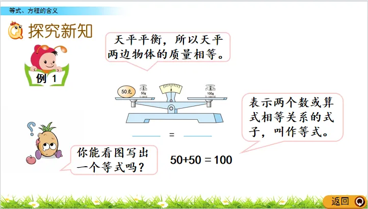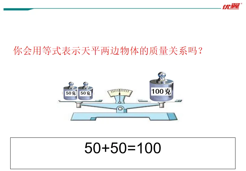你能用一个数学式子表示这时候的现象吗?(50+50=100或者50×2=100)为什么用等号连接?(因为等号两边的数相等)你能给这个式子起个名字吗?(等式)你能再举出一个等式的例子吗?