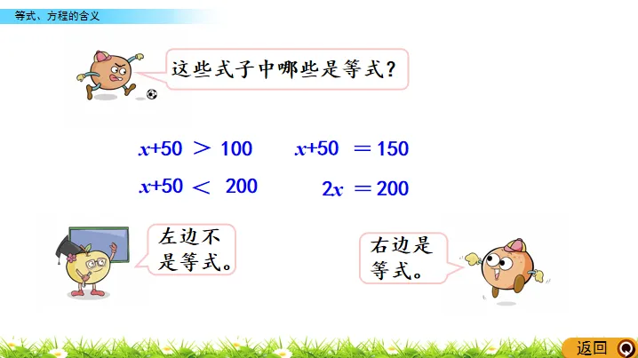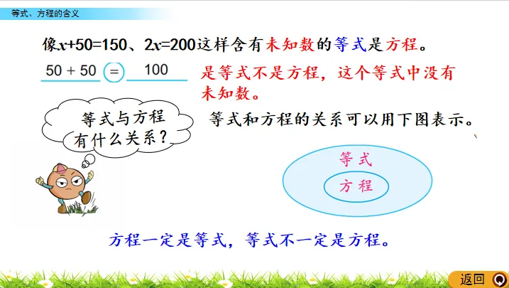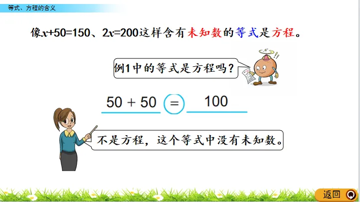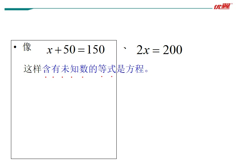 像x+50=100、2x=200这样含有未知数的等式是方程。