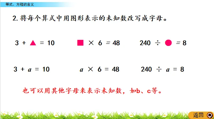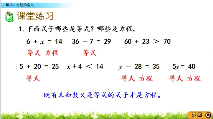 (板书:含有未知数的等式是方程)