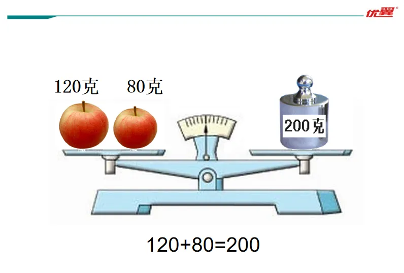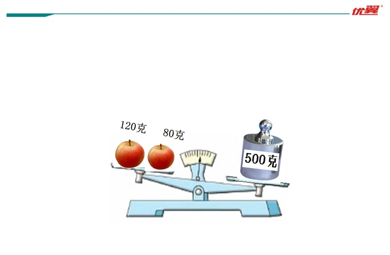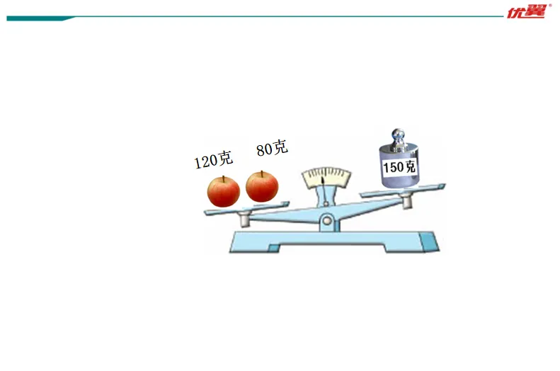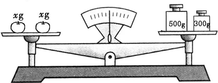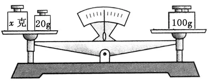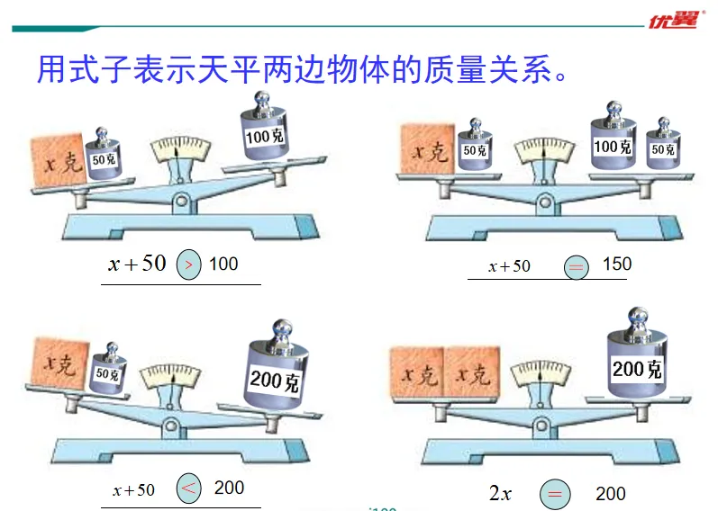 教师在左盘中放一个重x克的砝码,把右盘中的100g砝码换成标有200g的砝码,天平右边向下倾斜,让学生列出式子。