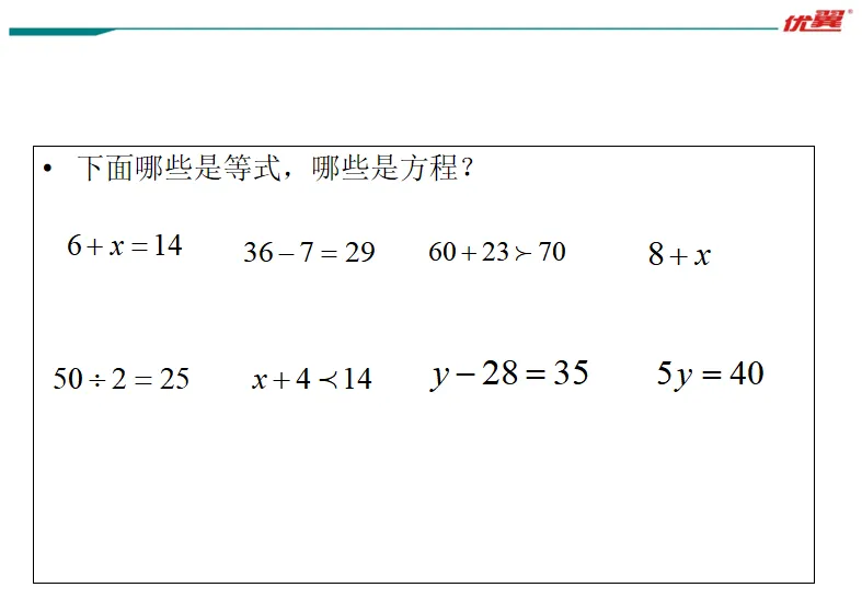 1、表示相等关系的式子叫做等式。2、含有未知数的等式是方程。3、方程一定是等式;等式不一定是方程。等式>方程