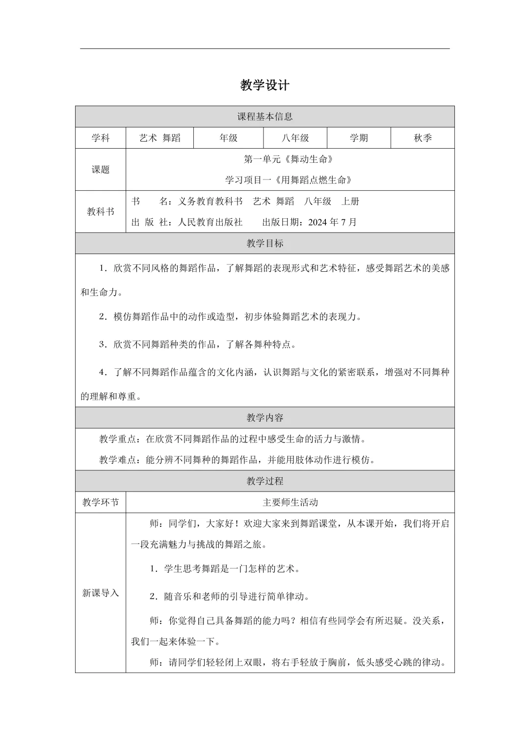 当前位置:首页>教案>初中艺术 舞蹈八年级上册(人教版)教案+PPT课件+练习,可下载编辑!