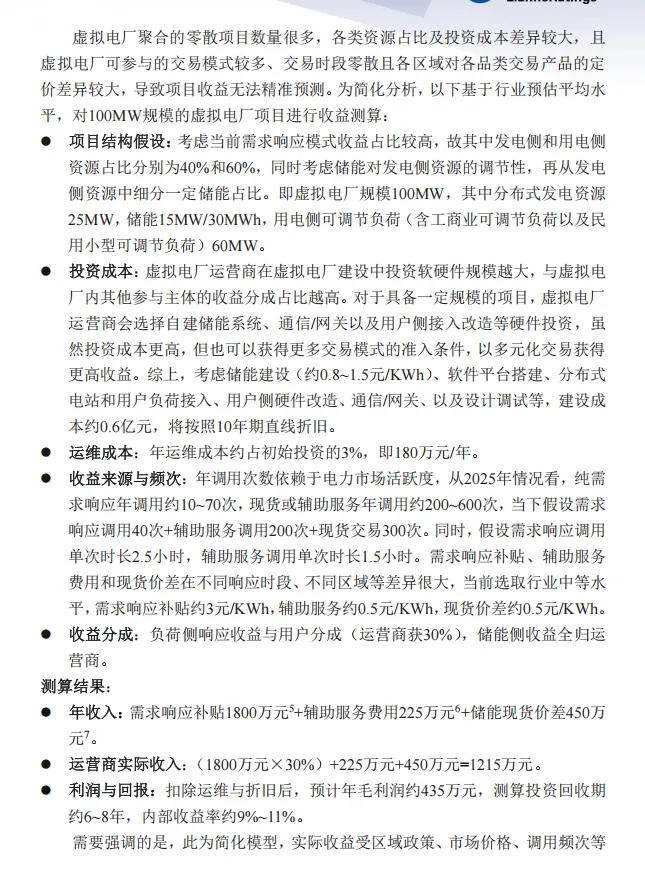 关于大家最关心的运营和盈利:咱们现在主要学德美经验,搞“需求响应聚合商”模式,未来会慢慢转向直接参与电能交易。给大家算笔账:100MW规模的项目,投资回收期大概6-8年,内部收益率9%-11%,看着还不错,但要注意,收益受政策、电力市场价格波动影响挺大。