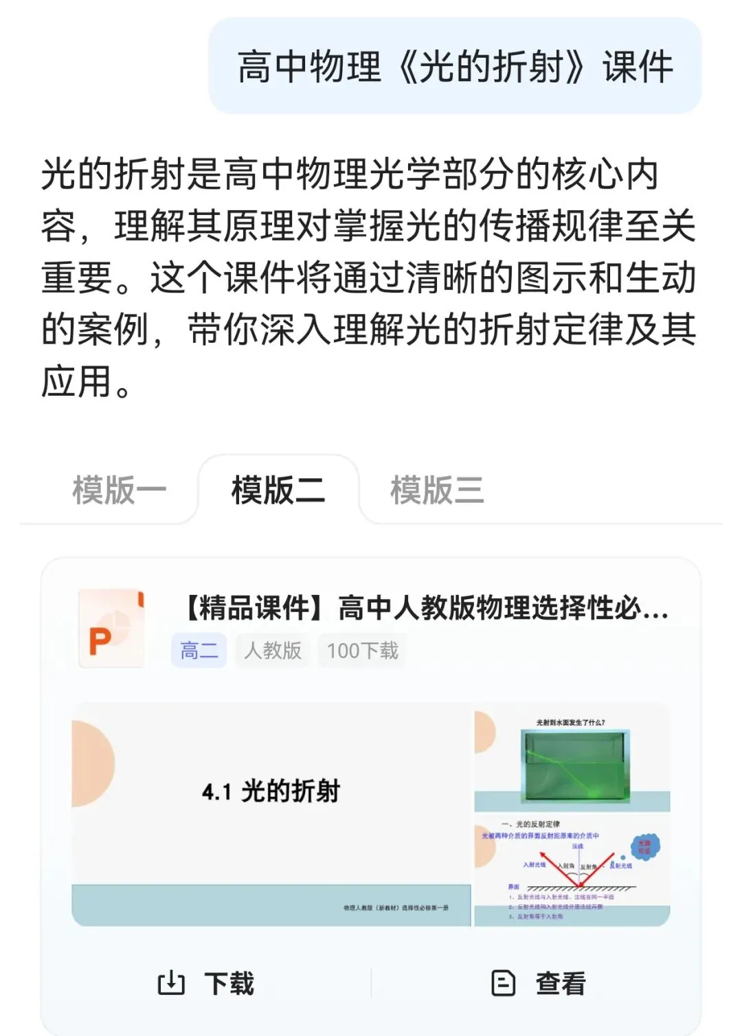 1. 打开APP,进入千问,直接在对话框输入课题名称(例:高中物理《光的折射》课件);