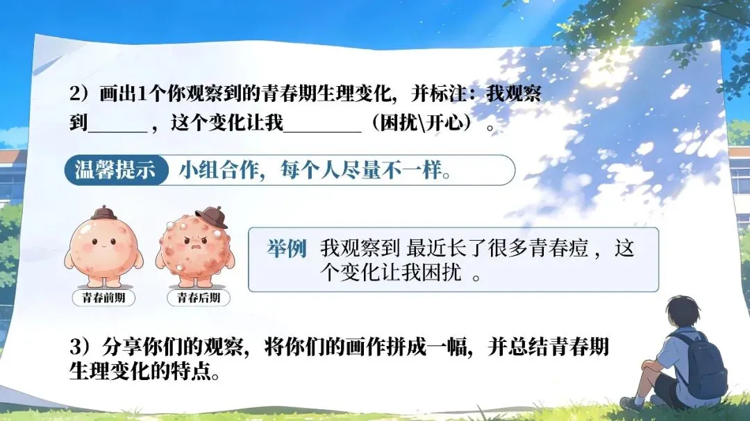 课件充分考虑初一学生青春期特点,设计有“青春期画作”、“主题辩论”、“盲盒漫画创作”等趣味活动,兼顾个人独立思考与团队协作探究,助力学生积极正视困惑与烦恼,从容迎接成长。