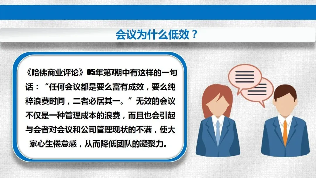很会企业的都会通过大大小小的会议来解决,商议问题和决策等,可是很多会议都存在低效且不能解决问题,并且还浪费时间。