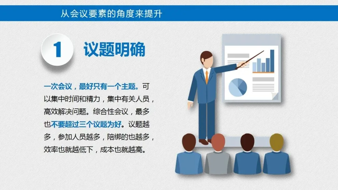 不讨论细节是会议的聚焦原则:会议核心功能是定方向、做决策、统思想,而非纠结具体操作细节。细节问题可交由专项小组会后对接处理,若在会议中过度纠缠技术参数、执行步骤等微观内容,会占用大量时间,导致核心议题无法深入推进,影响整体效率。