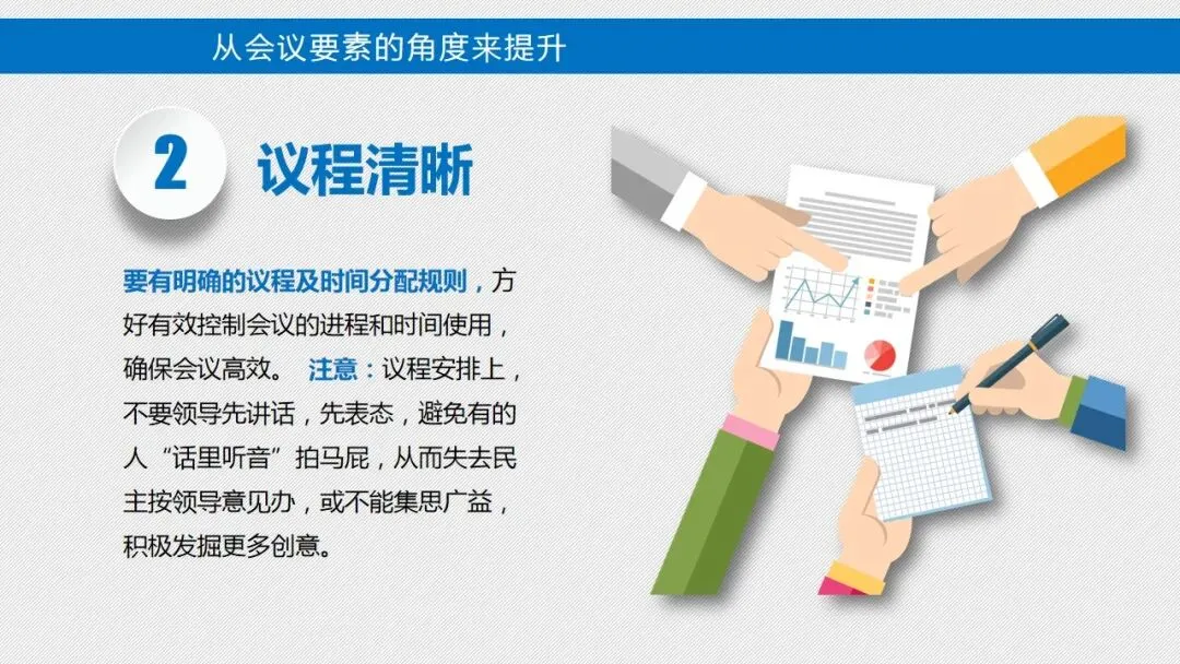 不搞一言堂是会议的民主保障:会议决策应基于集体智慧,主持人或核心成员需尊重每位参会者的表达权,避免独断专行、压制不同意见。鼓励多元视角碰撞,充分听取不同声音,通过平等讨论凝聚共识,让决策更全面、更具可行性,避免因单一视角导致决策偏差。