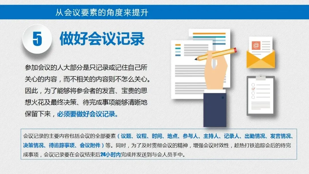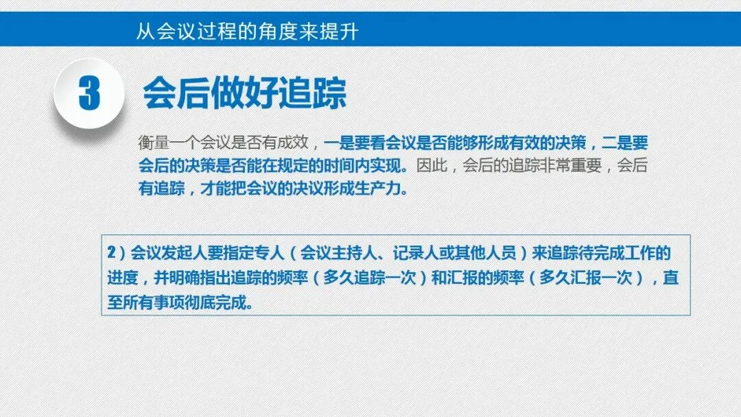 有检查是会议的落地关键:会后需形成明确的会议纪要,梳理决议事项、责任主体、完成时限;建立跟踪检查机制,定期督办任务进展,及时协调解决执行难题,确保会议形成的共识不流于纸面,真正转化为实际成果,形成“会议—执行—反馈”的闭环。
