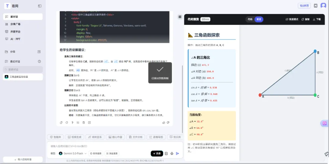 【提示词】我想给[初中生]讲授[三角函数],用html语言编写一段可交互动画,功能:三角形的三个点都可以随意移动,三个角可以进行度数调整,能够计算正弦,余弦,正切,根据图片中对三角函数的核心定义,包含在一个完整的HTML语言中。