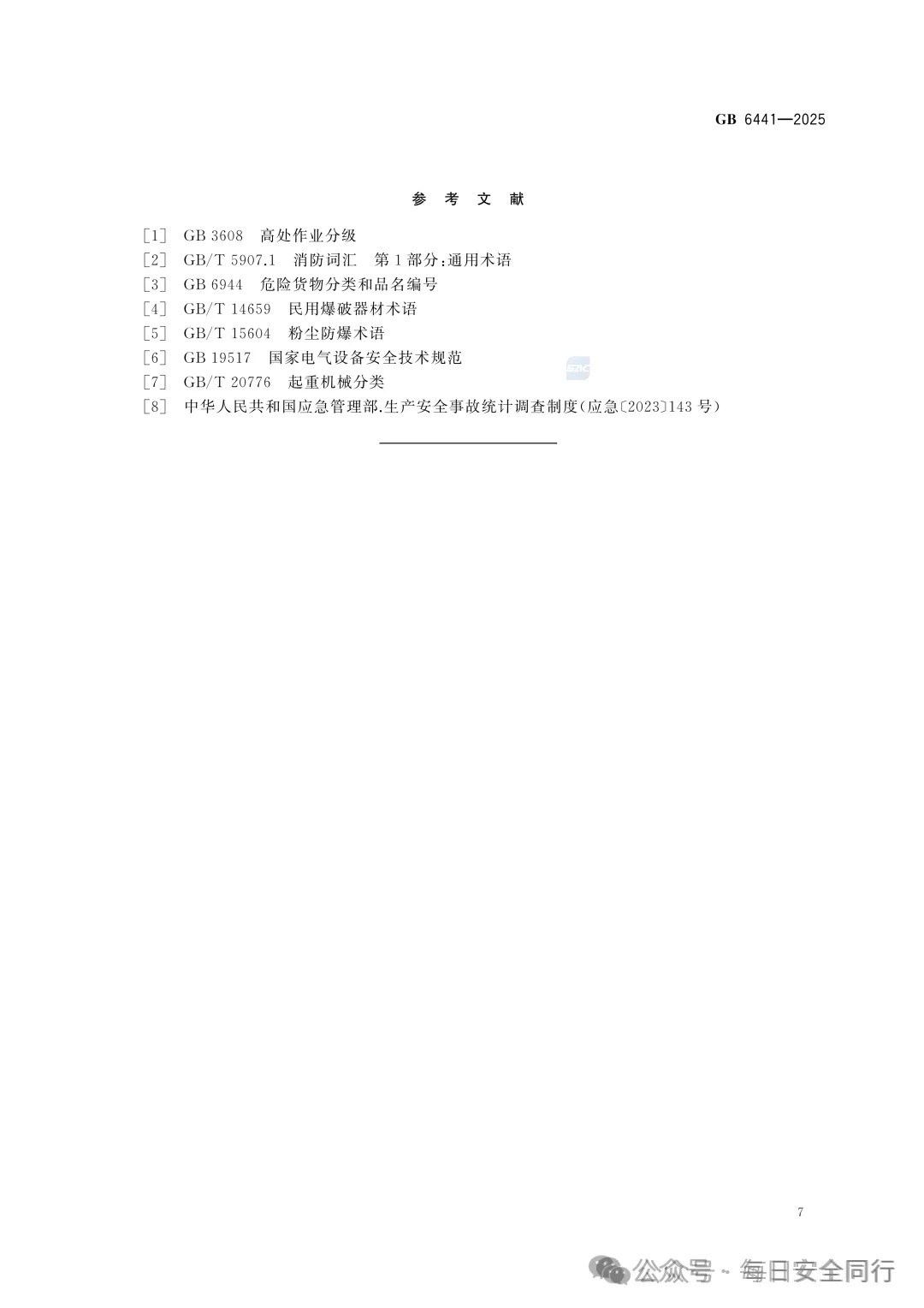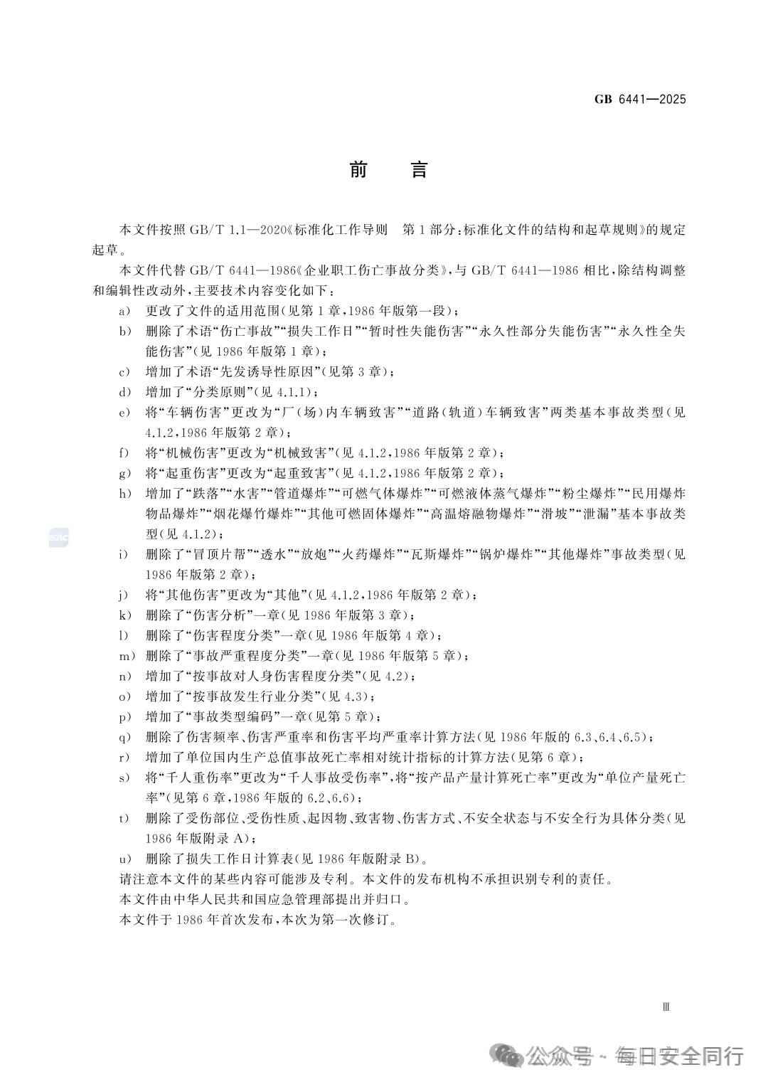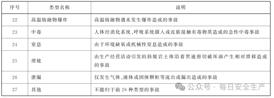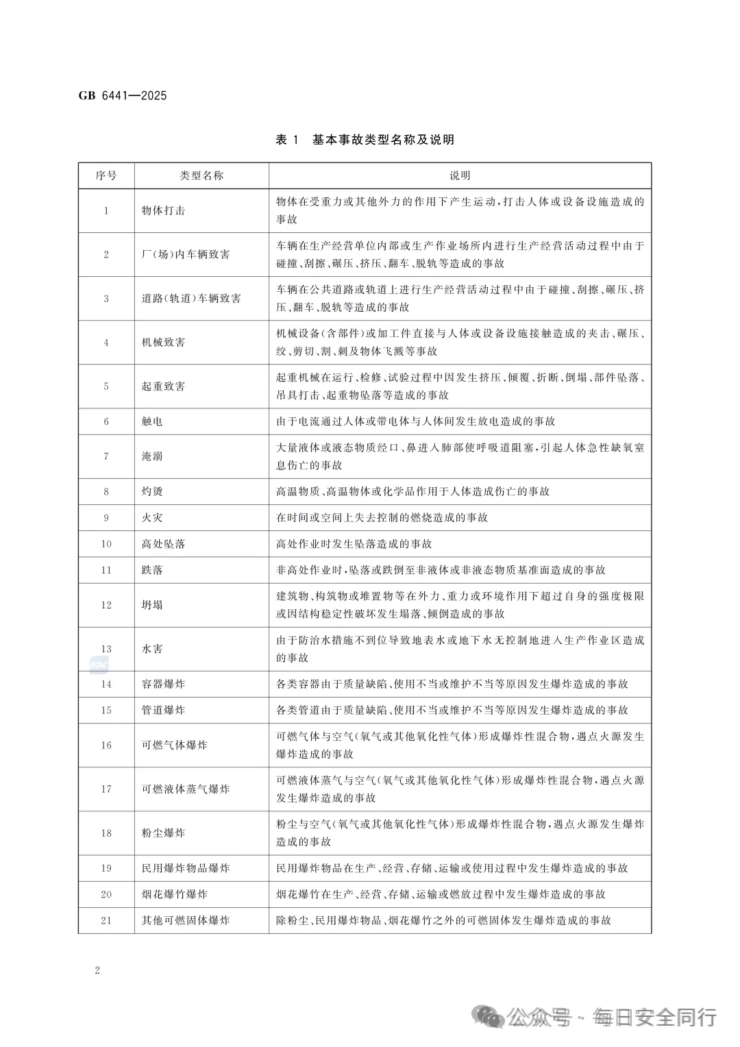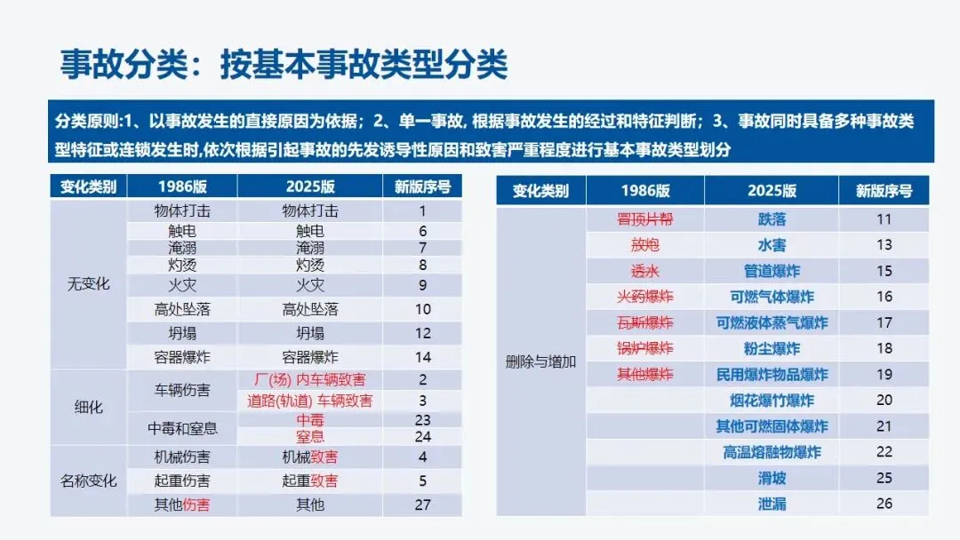 GB 6441-2025 《生产安全事故分类与编码》已正式发布,2026年7月1日实施!这部已经实施近40年的规范终于更新了,而且变更成了强制性规范。事故类型进一步细化,从20种细分至27种。之前征求意见稿为29类,正式稿为27类!不是29类!不是29类!29类不是正式稿,29类是错误的,请学习最新版本!27类事故类型是:物体打击、厂(场)内车辆致害、道路(轨道)车辆致害、机械致害、起重致害、触电、淹溺、灼烫、火灾、高处坠落、跌落、坍塌、水害、容器爆炸、管道爆炸、可燃气体爆炸、可燃液体蒸气爆炸、粉尘爆炸、民用爆炸物品爆炸、烟花爆竹爆炸、其他可燃固体爆炸、高温熔融物爆炸、中毒、窒息、滑坡、泄漏、其他原版资料已上传至星球【每日安全同行资料库】