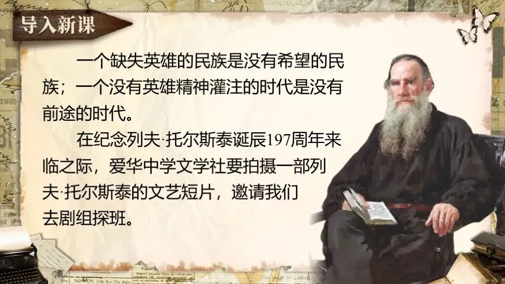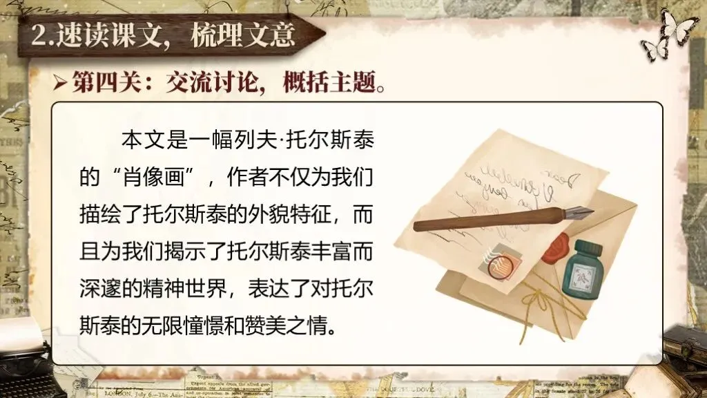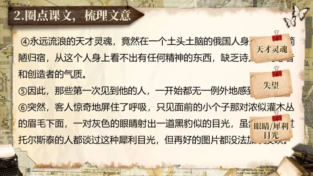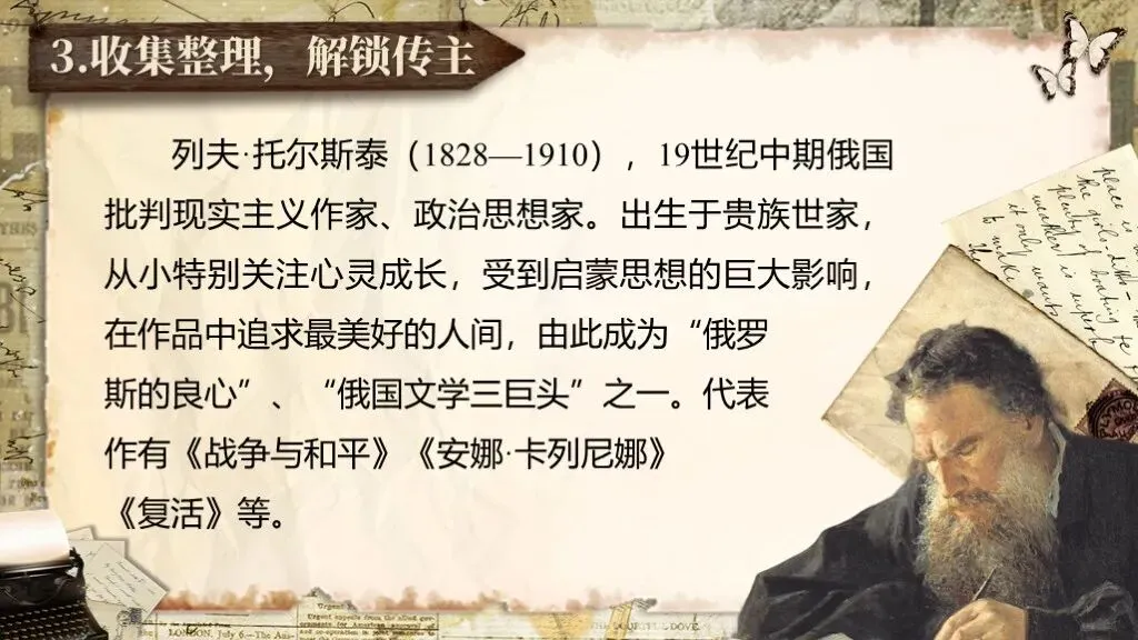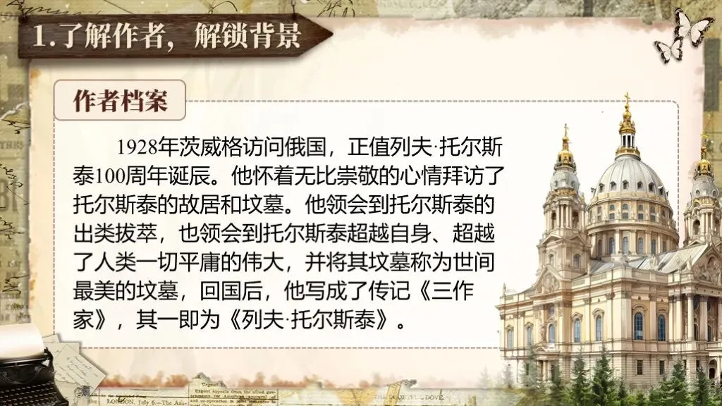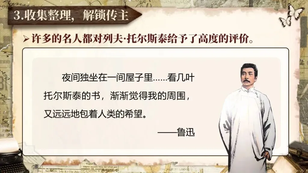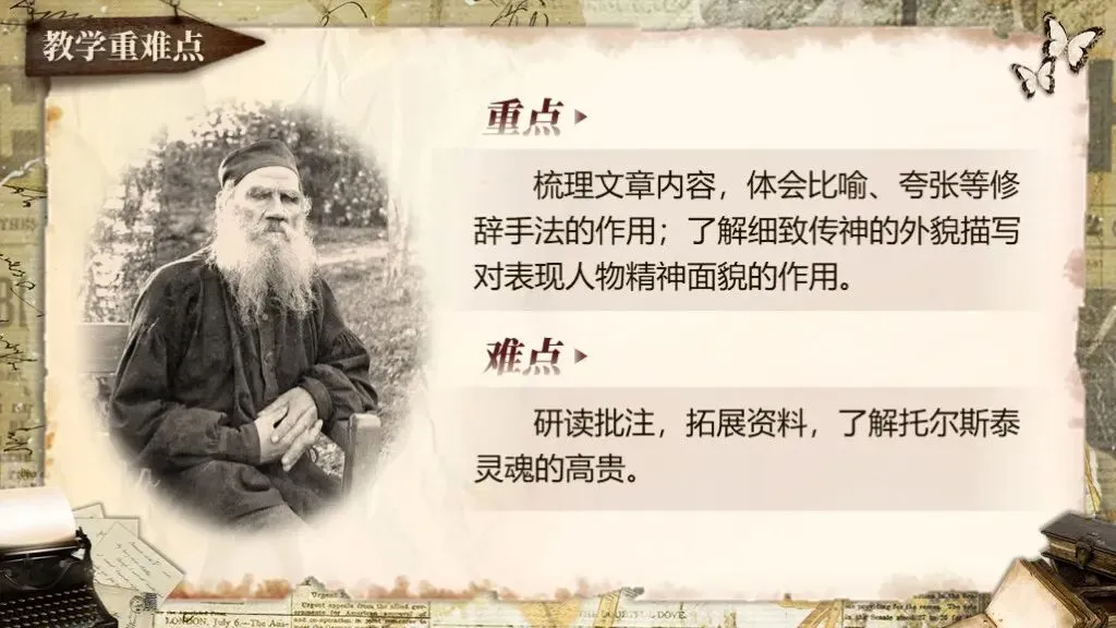 《列夫·托尔斯泰》是部编版七年级下册第一单元的一篇自读课文,是奥地利作家茨威格的传记作品中可以独立成篇的一节。作者以其力透纸背而又妙趣横生的文笔为我们描绘出一幅世界级大文豪托尔斯泰的肖像画,从而揭示出托尔斯泰深邃而卓越的精神世界。学习课文,我们可以借助批注进行阅读,悉心品味文中丰富而深厚的人文内涵。