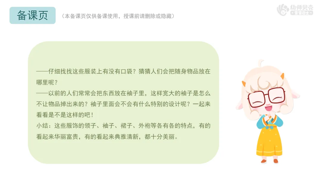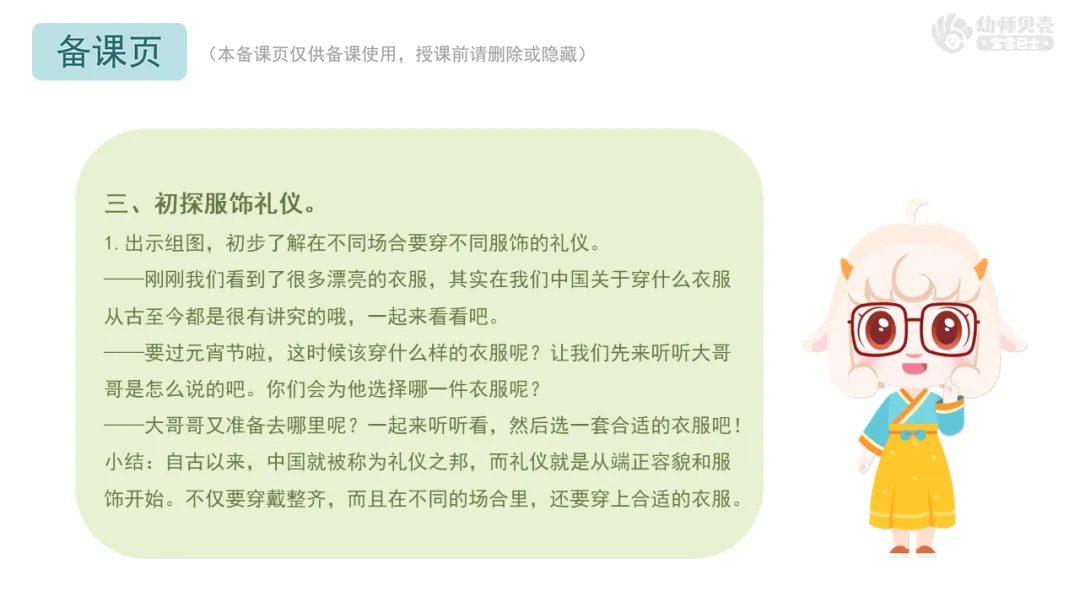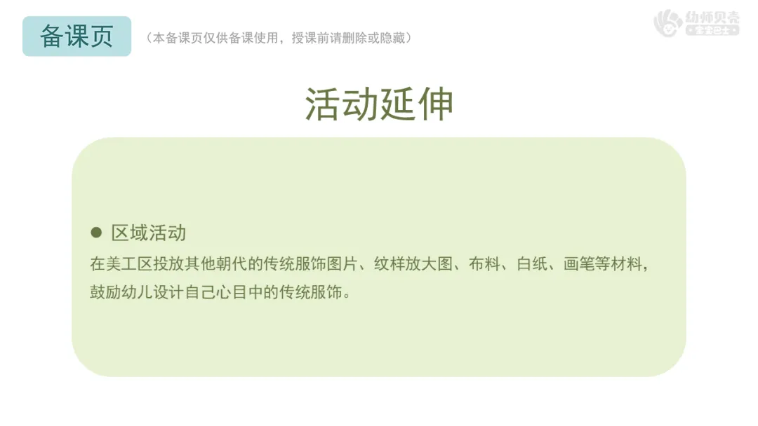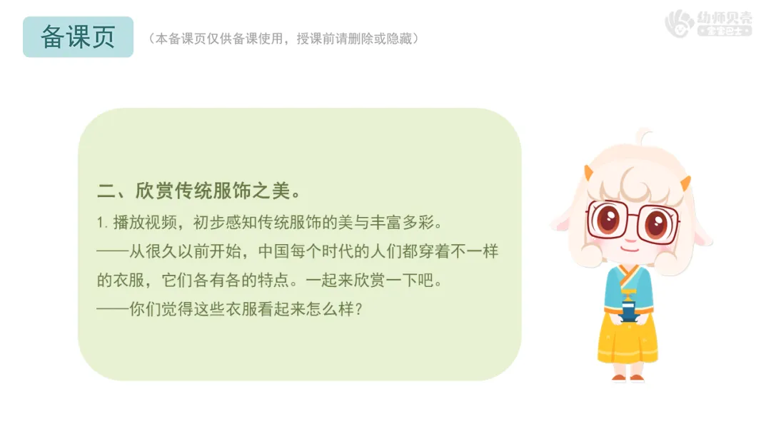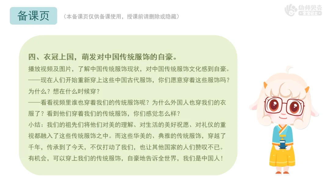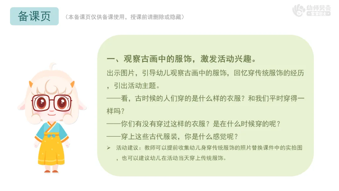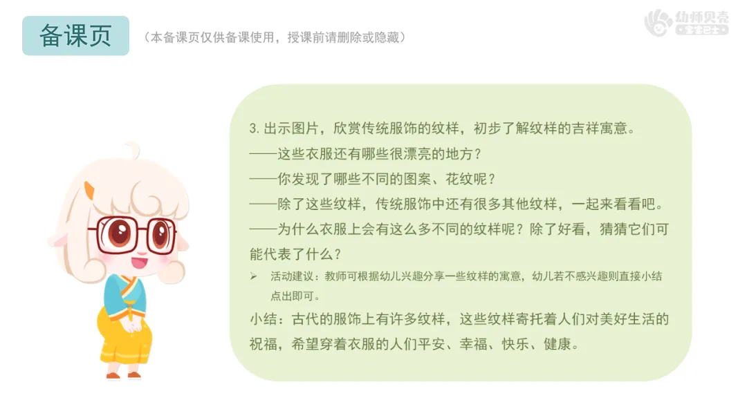 Ø活动建议:教师可以提前收集幼儿身穿传统服饰的照片替换课件中的实拍图,也可以建议幼儿在活动当天穿上传统服饰。