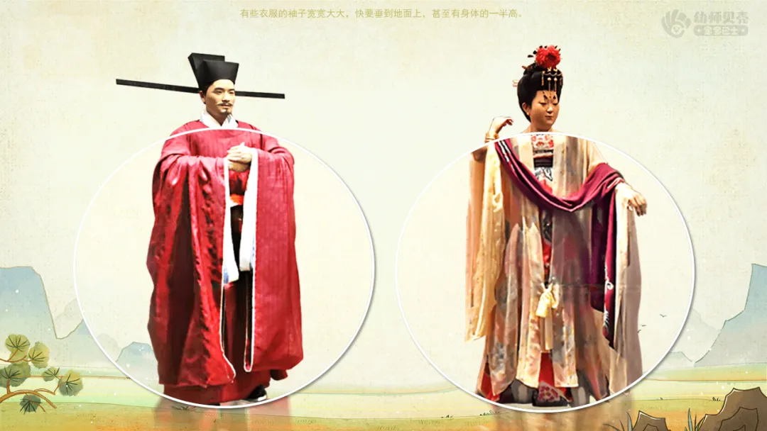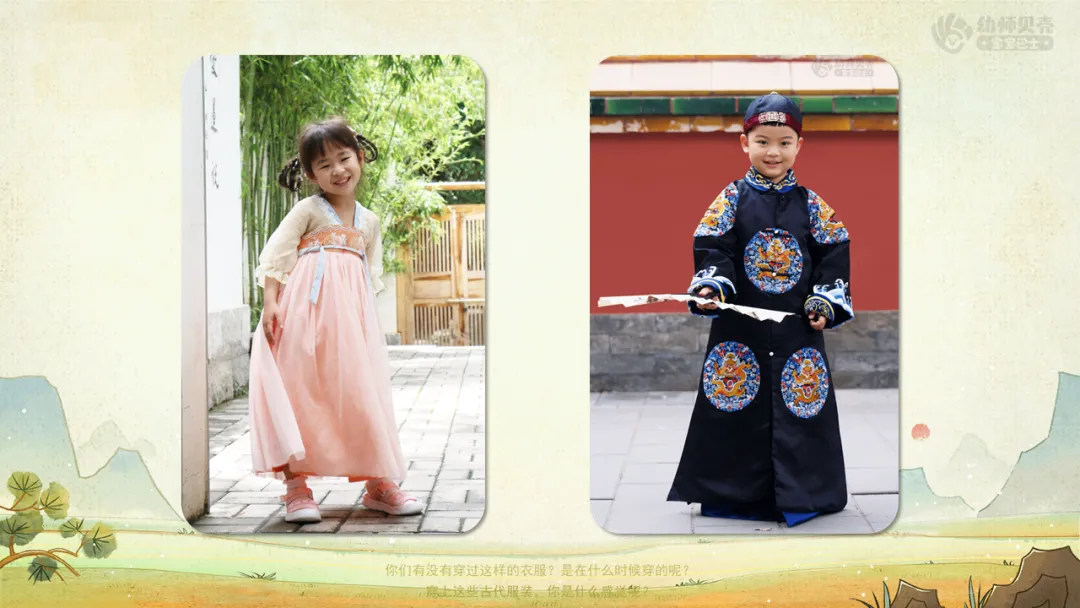 Ø活动建议:教师引导幼儿发现传统服饰与现代服饰形制上的不同,如袖子、衣领、裙子、男士长外袍等。
