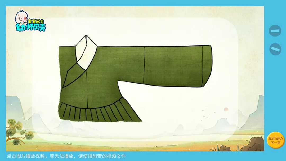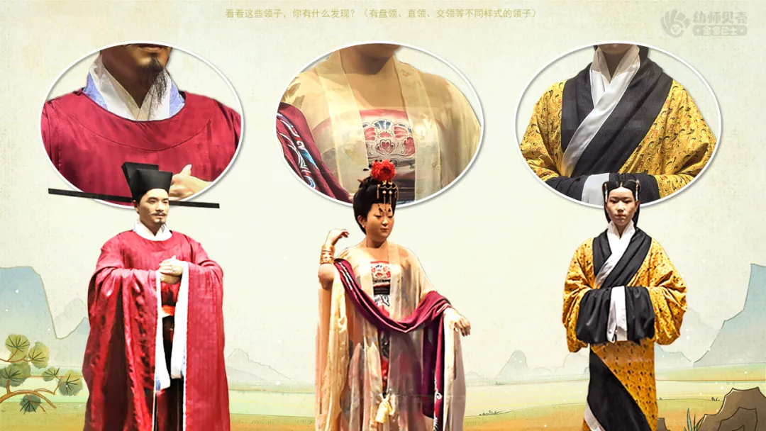 2.出示图片并播放音频,欣赏传统服饰的形制,发现其衣领、袖子等特点。