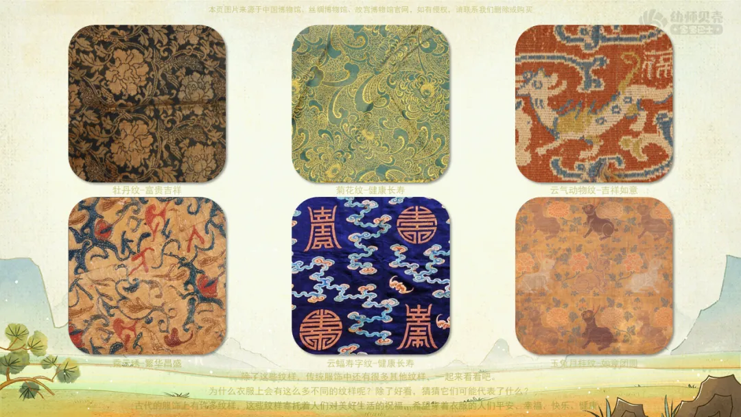 ——除了这些纹样,传统服饰中还有很多其他纹样,一起来看看吧。——为什么衣服上会有这么多不同的纹样呢?除了好看,猜猜它们可能代表了什么?