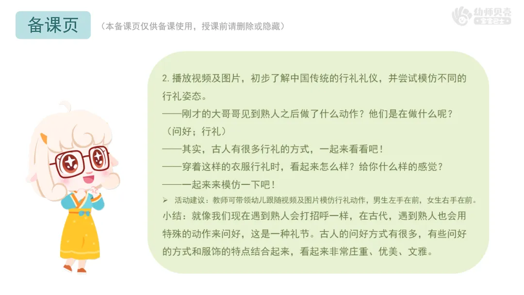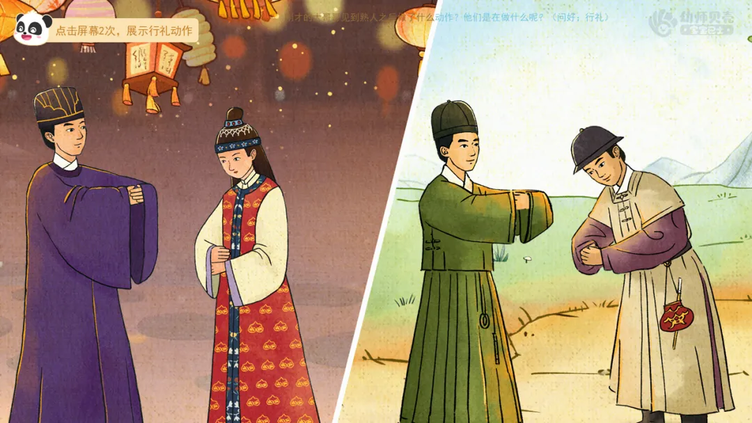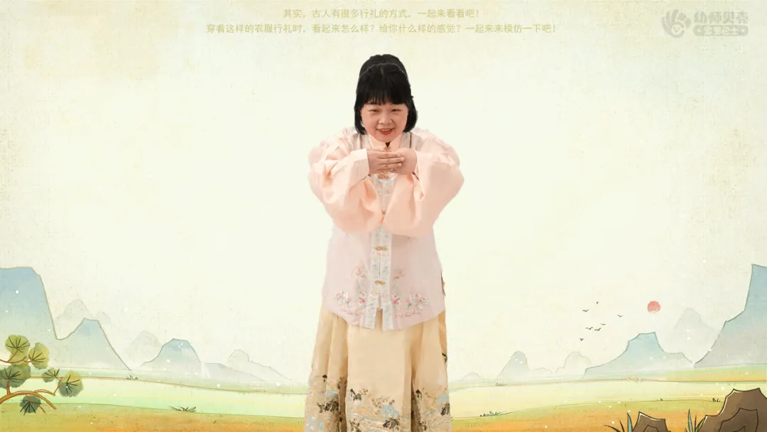l能够辨别传统服饰与现代服饰,并尝试模仿古代的行礼姿势。