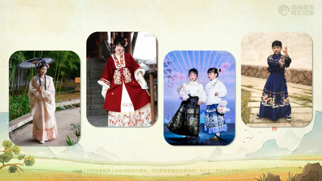 ——现在人们开始重新穿上这些中国古代服饰,你们愿意穿着这些服饰吗?为什么?想在什么时候穿?
