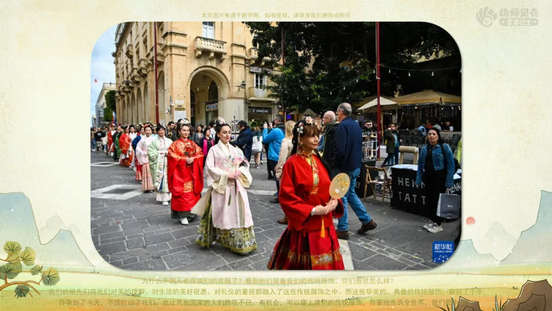 ——看看视频里谁也穿着我们的传统服饰呢?为什么外国人也穿我们的衣服了?看到他们穿着我们的传统服饰,你们感觉怎么样?