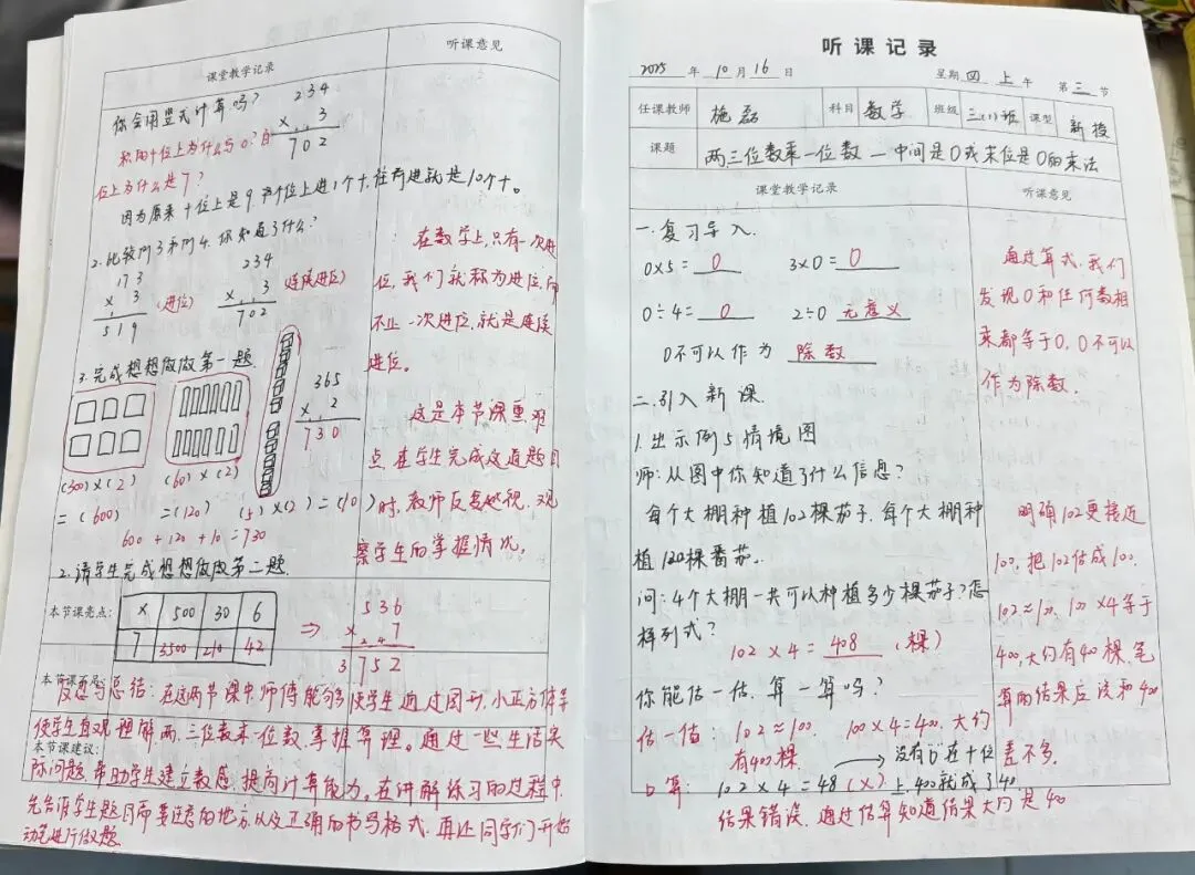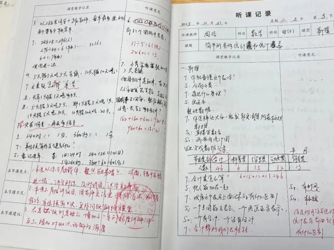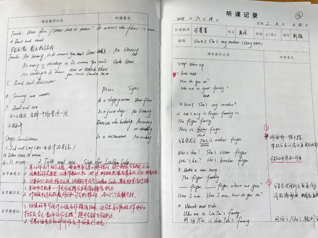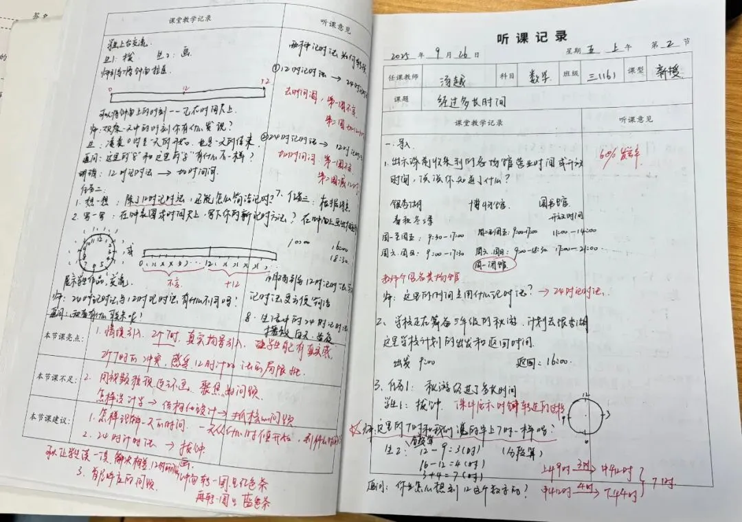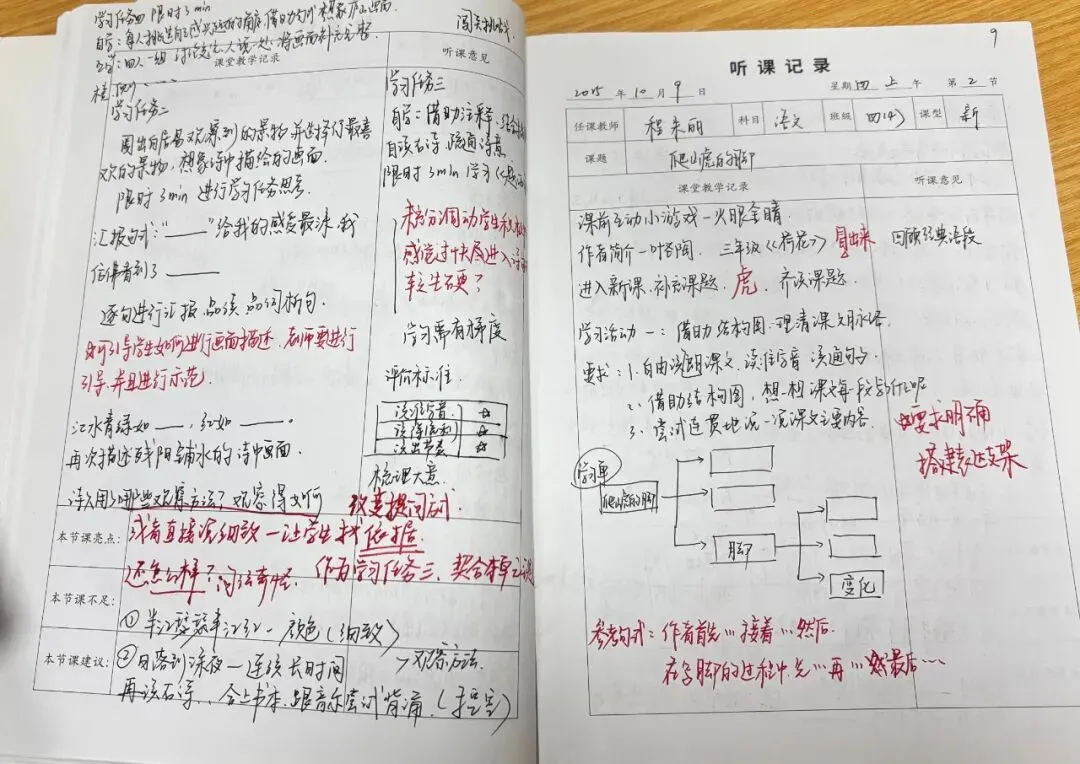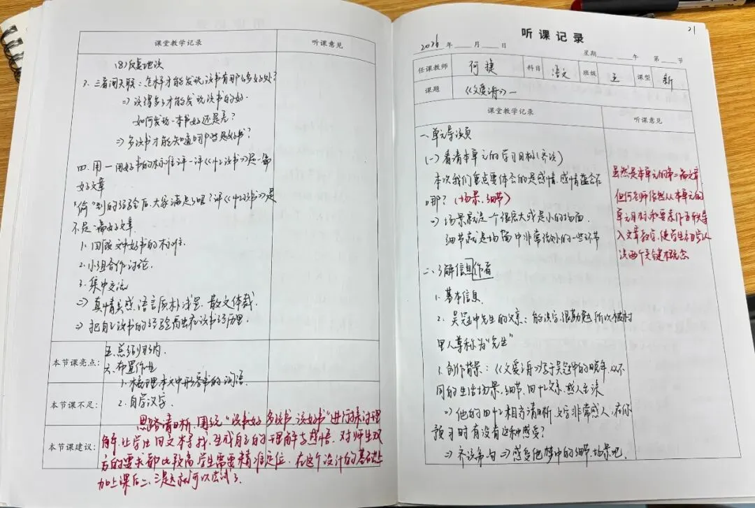 老师们的听课笔记字迹工整、内容详实,不仅清晰记录了课堂教学的流程脉络、重难点突破方法与精彩教学片段,更在“听课反思”栏中留下了深刻的思考:或分析教学亮点的可借鉴之处,或探讨课堂优化的改进方向,或结合自身教学实践提出个性化感悟,真正实现了“听课—思考—提升”的良性闭环。