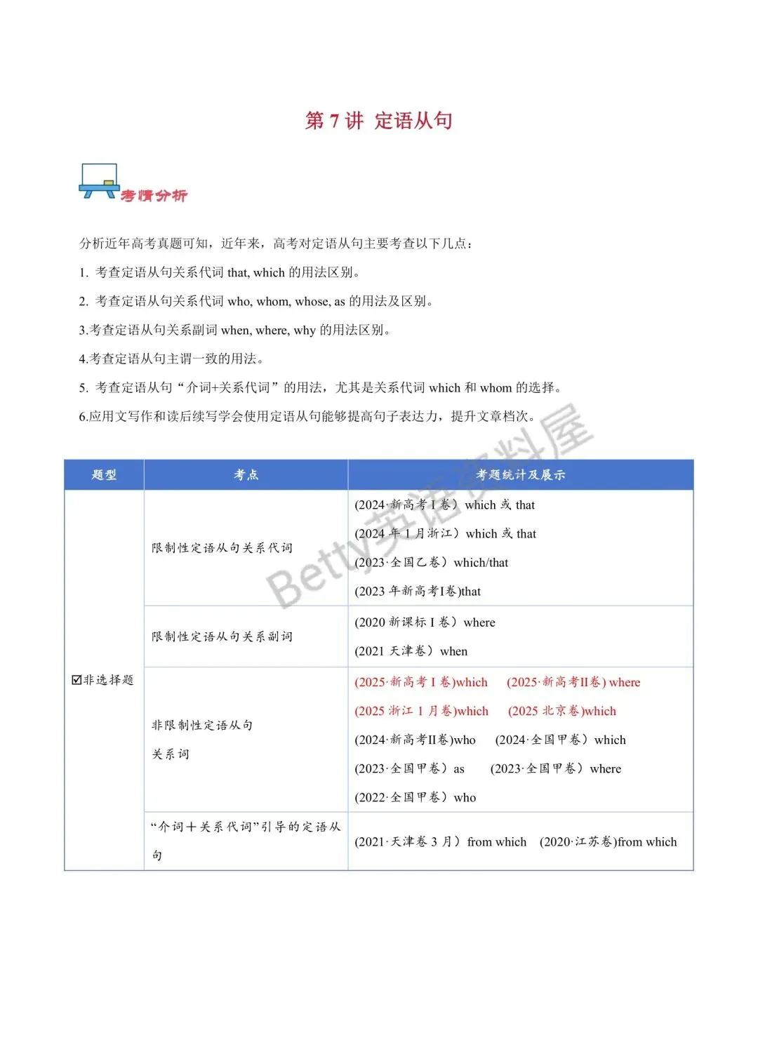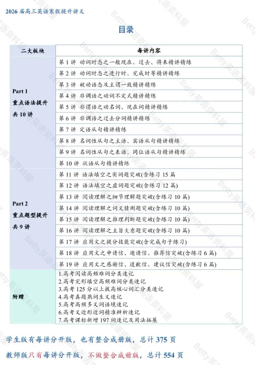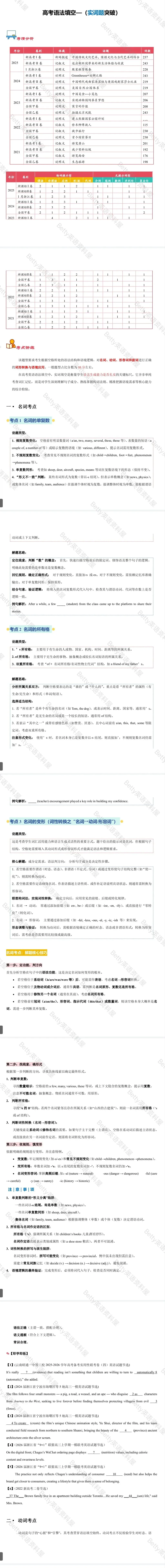 1.因为寒假课时较短,语法专题是整理的高考高频且较难的时态、非谓语、三大从句;