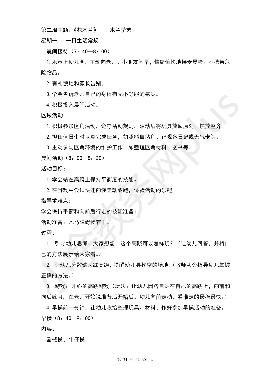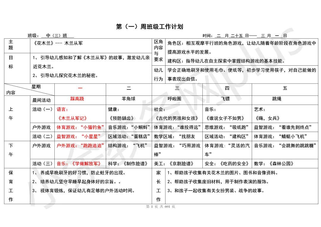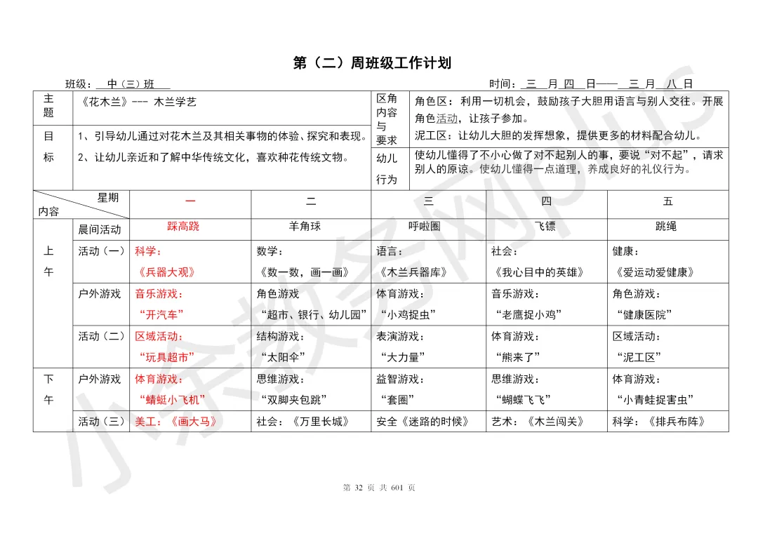 幼儿园中班春季下学期周计划和教案模板(1 - 18 周)。