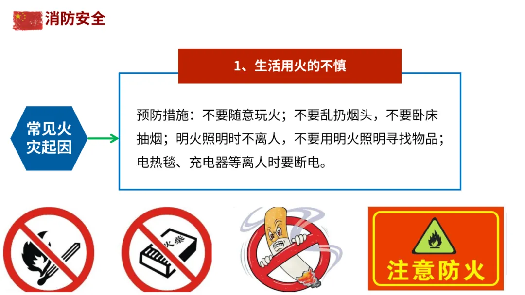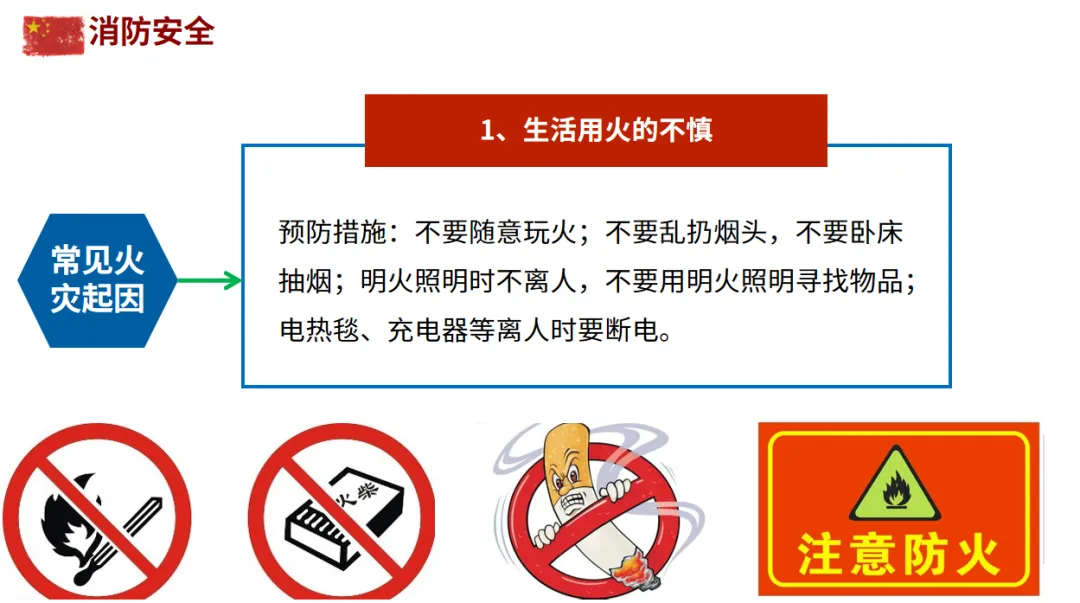 生活用火:不卧床抽烟、不乱扔烟头;电热毯、充电器离人时断电,避免长时间通电。