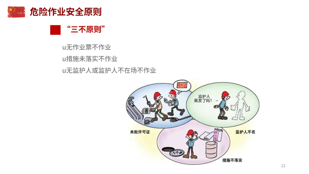 危险作业遵循 “三不原则”:无作业票、安全措施未落实、无监护人或监护人不在场严禁作业。