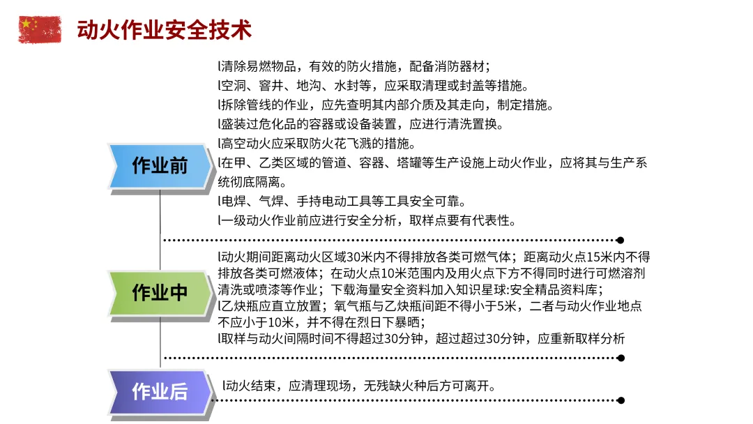 动火作业:清除周边10米内易燃物,配备消防器材;氧气瓶与乙炔瓶间距不小于5米,距动火点不小于10米;作业后清理现场,确认无残火后方可离开。